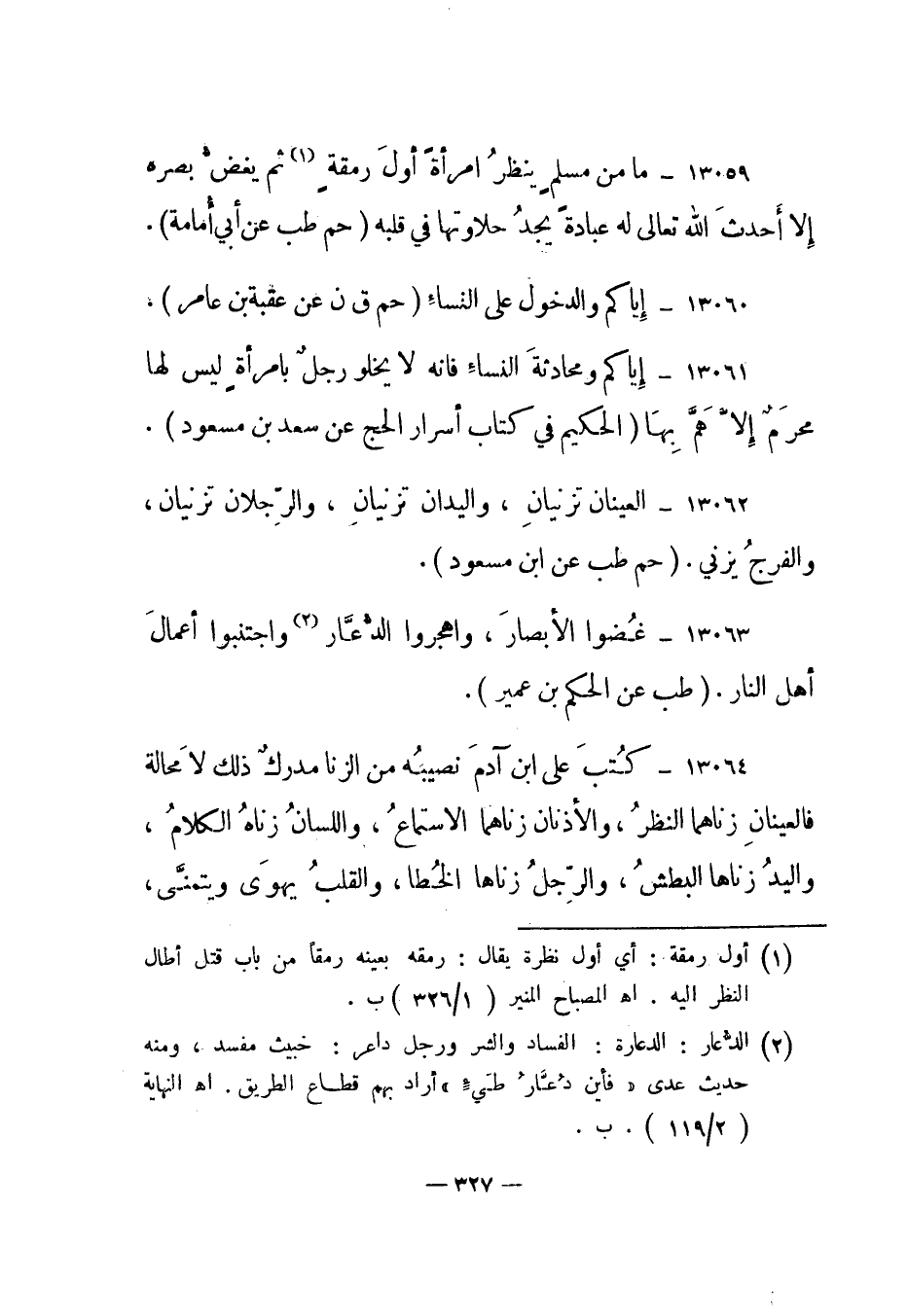 13064- كتب على ابن آدم نصيبه من الزنا مدرك ذلك لا محالة فالعينان زناهما النظر، والأذنان زناهما الاستماع، واللسان زناه الكلام، واليد زناها البطش، والرجل زناها الخطا، والقلب يهوى ويتمنى،