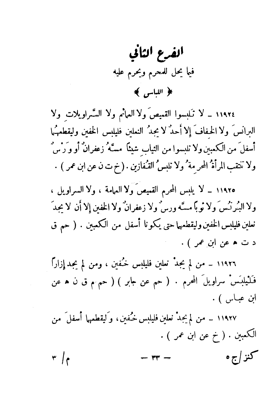 11924- لا تلبسوا القميص ولا العمائم ولا السراويلات ولا البرانس ولا الخفاف إلا أحد لا يجد النعلين فليلبس الخفين وليقطعهما أسفل من الكعبين ولا تلبسوا من الثياب شيئا مسه زعفران أو ورس ولا تنتقب المرأة المحرمة ولا تلبس القفازين "خ ت ن عن ابن عمر".