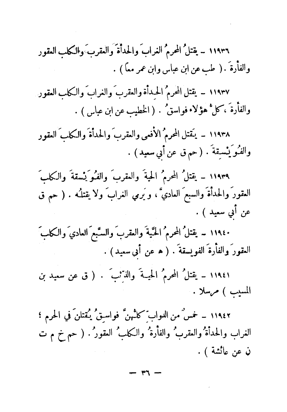 11939- يقتل المحرم الحية والعقرب والفويسقة والكلب العقور والحدأة والسبع العادي، ويرمي الغراب ولا يقتله. "حم ق عن أبي سعيد".