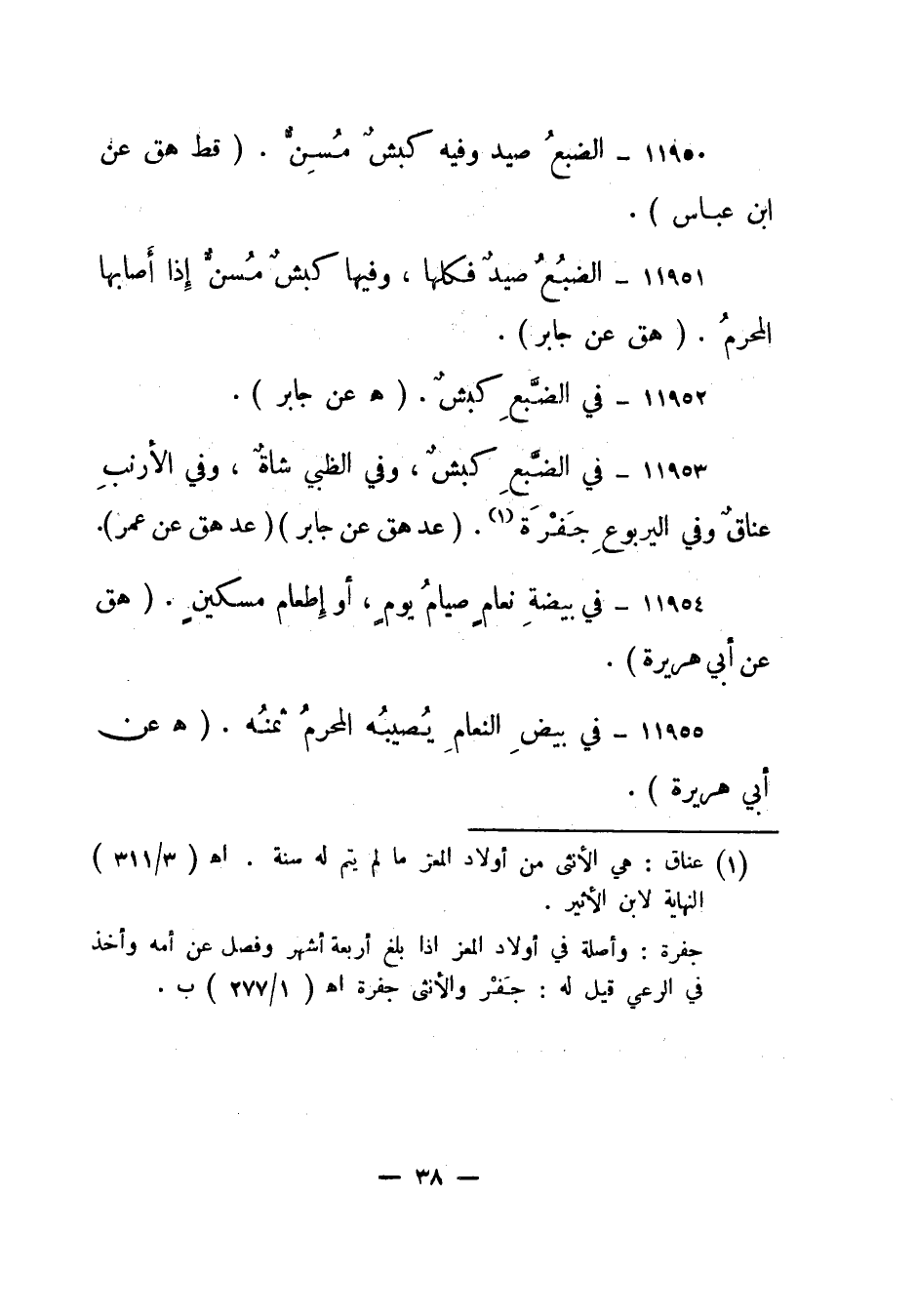11953- في الضبع كبش، وفي الظبي شاة، وفي الأرنب عناق وفي اليربوع جفرة1 "عد هق عن جابر" "عد هق عن عمر".