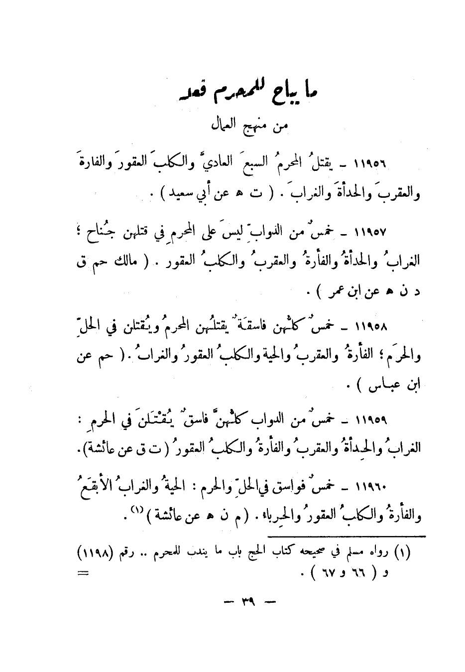 11957- خمس من الدواب ليس على المحرم في قتلهن جناح؛ الغراب والحدأة والفأرة والعقرب والكلب العقور.ى "مالك حم ق د ن هـ عن ابن عمر".