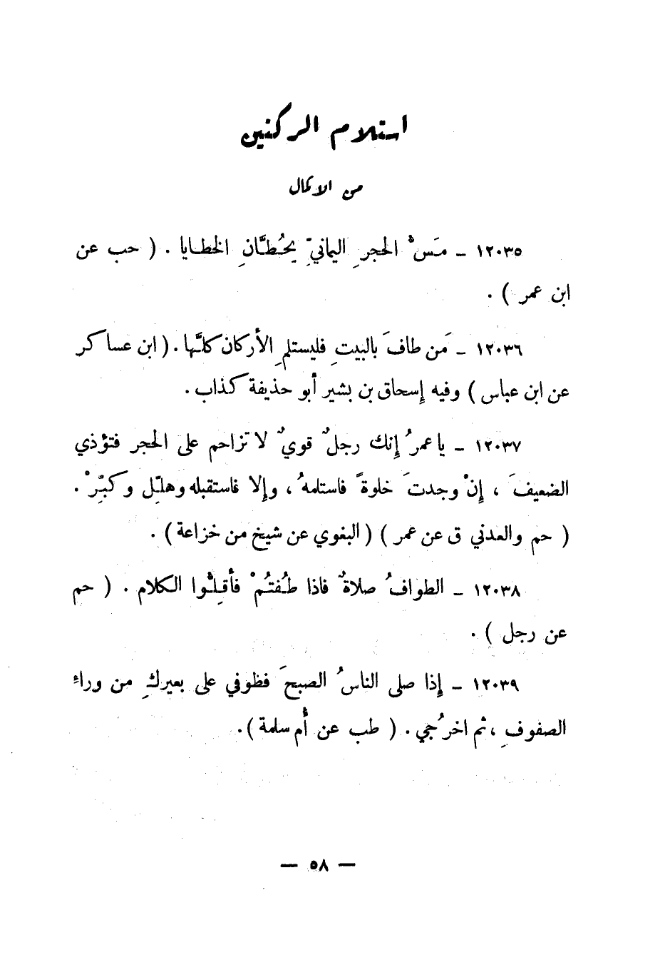 12036- من طاف بالبيت فليستلم الأركان كلها. "ابن عساكر عن ابن عباس" وفيه إسحاق بن بشير أبو حذيفة كذاب.