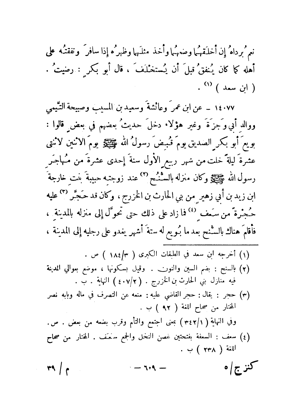 14077- عن ابن عمر وعائشة وسعيد بن المسيب وصبيحة التيمي ووالد أبي وجزة وغير هؤلاء دخل حديث بعضهم في بعض قالوا: بويع أبو بكر الصديق يوم قبض رسول الله صلى الله عليه وسلم يوم الاثنين لاثنتي عشرة ليلة خلت من شهر ربيع الأول سنة إحدى عشرة من مهاجر رسول الله صلى الله عليه وسلم وكان منزله بالسنح2 عند زوجته حبيبة بنت خارجة ابن زيد بن أبي زهير من بني الحارث بن الخزرج، وكان قد حجر3 عليه حجرة من سعف4 فما زاد على ذلك حتى تحول إلى منزله بالمدينة، فأقام هناك بالسنح بعد ما بويع له ستة أشهر يغدو على رجليه إلى المدينة،