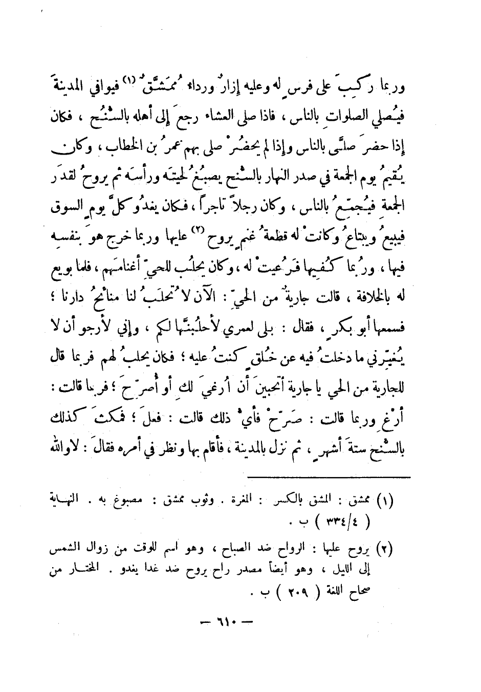 وربما ركب على فرس له وعليه إزار ورداء ممشق1 فيوافي المدينة فيصلي الصلوات بالناس، فإذا صلى العشاء رجع إلى أهله بالسنح، فكان إذا حضر صلى بالناس وإذا لم يحضر صلى بهم عمر بن الخطاب، وكان يقيم يوم الجمعة في صدر النهار بالسنح يصبغ لحيته ورأسه ثم يروح لقدر الجمعة فيجمع بالناس، وكان رجلا تاجرا، فكان يغدو كل يوم السوق فيبيع ويبتاع وكانت له قطعة غنم يروح2 عليها وربما خرج هو بنفسه فيها، وربما كفيها فرعيت له، وكان يحلب للحي أغنامهم، فلما بويع له بالخلافة، قالت جارية من الحي: الآن لا تحلب لنا منائح دارنا؛ فسمعها أبو بكر، فقال: بلى لعمري لأحلبنها لكم، وإني لأرجو أن لا يغيرني ما دخلت فيه عن خلق كنت عليه؛ فكان يحلب لهم فربما قال للجارية من الحي يا جارية أتحبين أن أرغي لك أو أصرح؛ فربما قالت: أرغ وربما قالت: صرح فأي ذلك قالت: فعل؛ فمكث كذلك بالسنح ستة أشهر، ثم نزل بالمدينة، فأقام بها ونظر في أمره فقال: لا والله