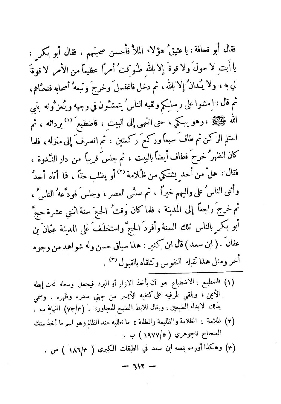 فقال أبو قحافة: يا عتيق هؤلاء الملأ فأحسن صحبتهم، فقال أبو بكر: يا أبت لا حول ولا قوة إلا بالله طوقت أمرا عظيما من الأمر لا قوة لي به، ولا يدان إلا بالله، ثم دخل فاغتسل وخرج وتبعه أصحابه فنحاهم، ثم قال: امشوا على رسلكم ولقيه الناس يتمشون في وجهه ويعزونه بنبي الله صلى الله عليه وسلم، وهو يبكي، حتى انتهى إلى البيت، فاضطبع1 بردائه، ثم استلم الركن ثم طاف سبعا وركع ركعتين، ثم انصرف إلى منزله، فلما كان الظهر خرج فطاف أيضا بالبيت، ثم جلس قريبا من دار الندوة، فقال: هل من أحد يشتكي من ظلامة2 أو يطلب حقا، فما أتاه أحد وأثنى الناس على واليهم خيرا، ثم صلى العصر، وجلس فودعه الناس، ثم خرج راجعا إلى المدينة، فلما كان وقت الحج سنة اثنتي عشرة حج أبو بكر بالناس تلك السنة وأفرد الحج واستخلف على المدينة عثمان بن عفان. "ابن سعد" قال ابن كثير: هذا سياق حسن وله شواهد من وجوه أخر ومثل هذا تقبله النفوس وتتلقاه بالقبول3