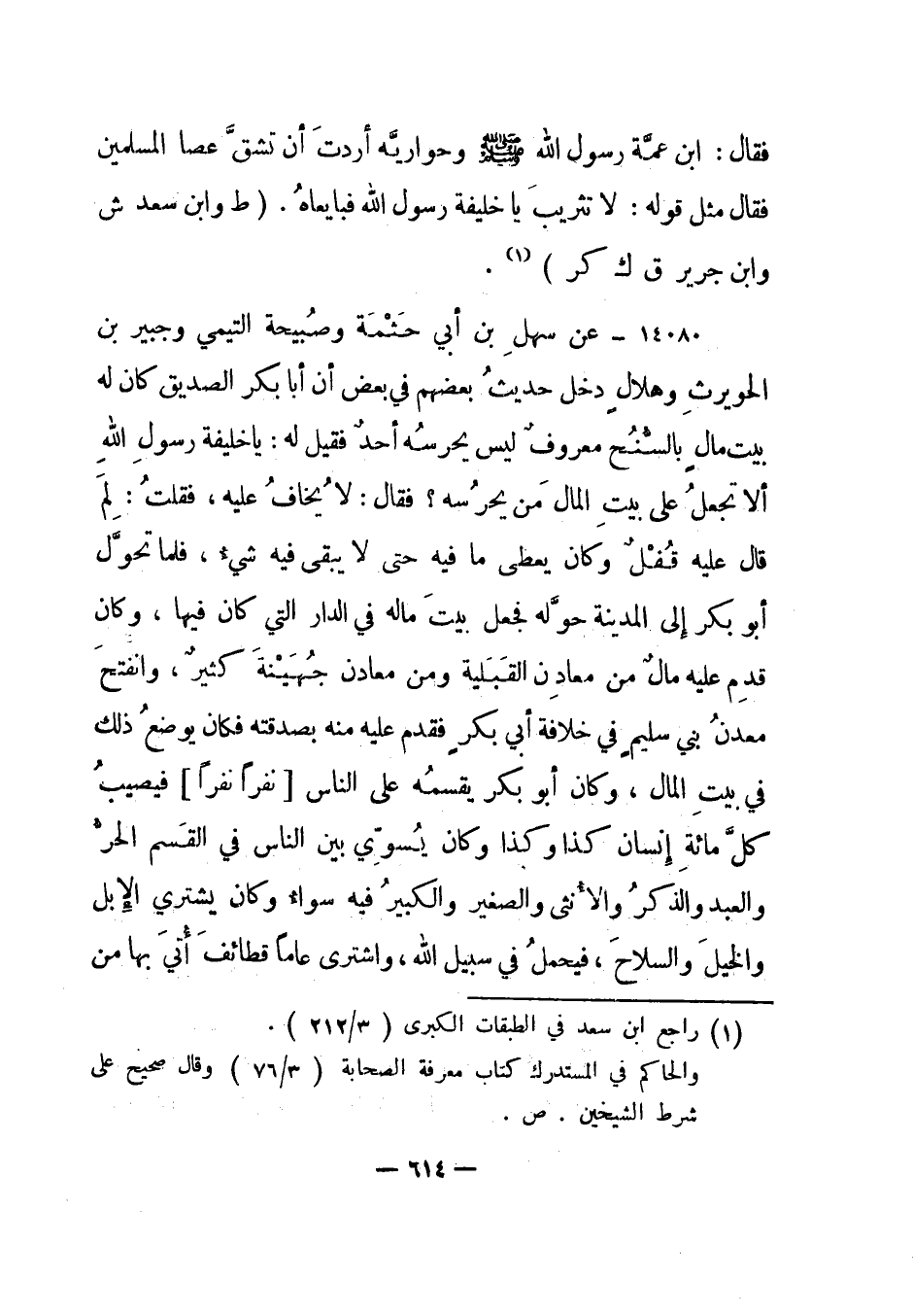 14080- عن سهل بن أبي حثمة وصبيحة التيمي وجبير بن الحويرث وهلال دخل حديث بعضهم في بعض أن أبا بكر الصديق كان له بيت مال بالسنح معروف ليس يحرسه أحد فقيل له: يا خليفة رسول الله ألا تجعل على بيت المال من يحرسه؟ فقال: لا يخاف عليه، فقلت: لم قال عليه قفل وكان يعطى ما فيه حتى لا يبقى فيه شيء، فلما تحول أبو بكر إلى المدينة حوله فجعل بيت ماله في الدار التي كان فيها، وكان قدم عليه مال من معادن القبلية ومن معادن جهينة كثير، وانفتح معدن بني سليم في خلافة أبي بكر فقدم عليه منه بصدقته فكان يوضع ذلك في بيت المال، وكان أبو بكر يقسمه على الناس [نفرا نفرا] فيصيب كل مائة إنسان كذا وكذا وكان يسوي بين الناس في القسم الحر والعبد والذكر والأنثى والصغير والكبير فيه سواء وكان يشتري الإبل والخيل والسلاح، فيحمل في سبيل الله، واشترى عاما قطائف أتي بها من