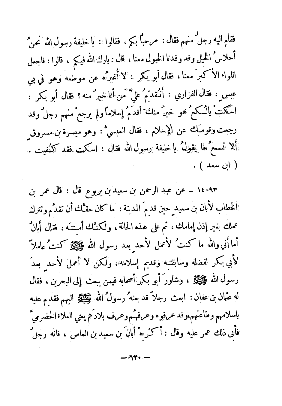 14093- عن عبد الرحمن بن سعيد بن يربوع قال: قال عمر بن الخطاب لأبان بن سعيد حين قدم المدينة: ما كان حقك أن تقدم وتترك عملك بغير إذن إمامك، ثم على هذه الحالة، ولكنك أمنته، فقال أبان أما أني والله ما كنت لأعمل لأحد بعد رسول الله صلى الله عليه وسلم كنت عاملا لأبي بكر لفضله وسابقته وقديم إسلامه، ولكن لا أعمل لأحد بعد رسول الله صلى الله عليه وسلم، وشاور أبو بكر أصحابه فيمن يبعث إلى البحرين، فقال له عثمان بن عفان: ابعث رجلا قد بعثه رسول الله صلى الله عليه وسلم إليهم فقدم عليه بإسلامهم وطاعتهم، وقد عرفوه وعرفهم وعرف بلادهم يعني العلاء الحضرمي فأبى ذلك عمر عليه وقال: أكره أبان بن سعيد بن العاص، فإنه رجل