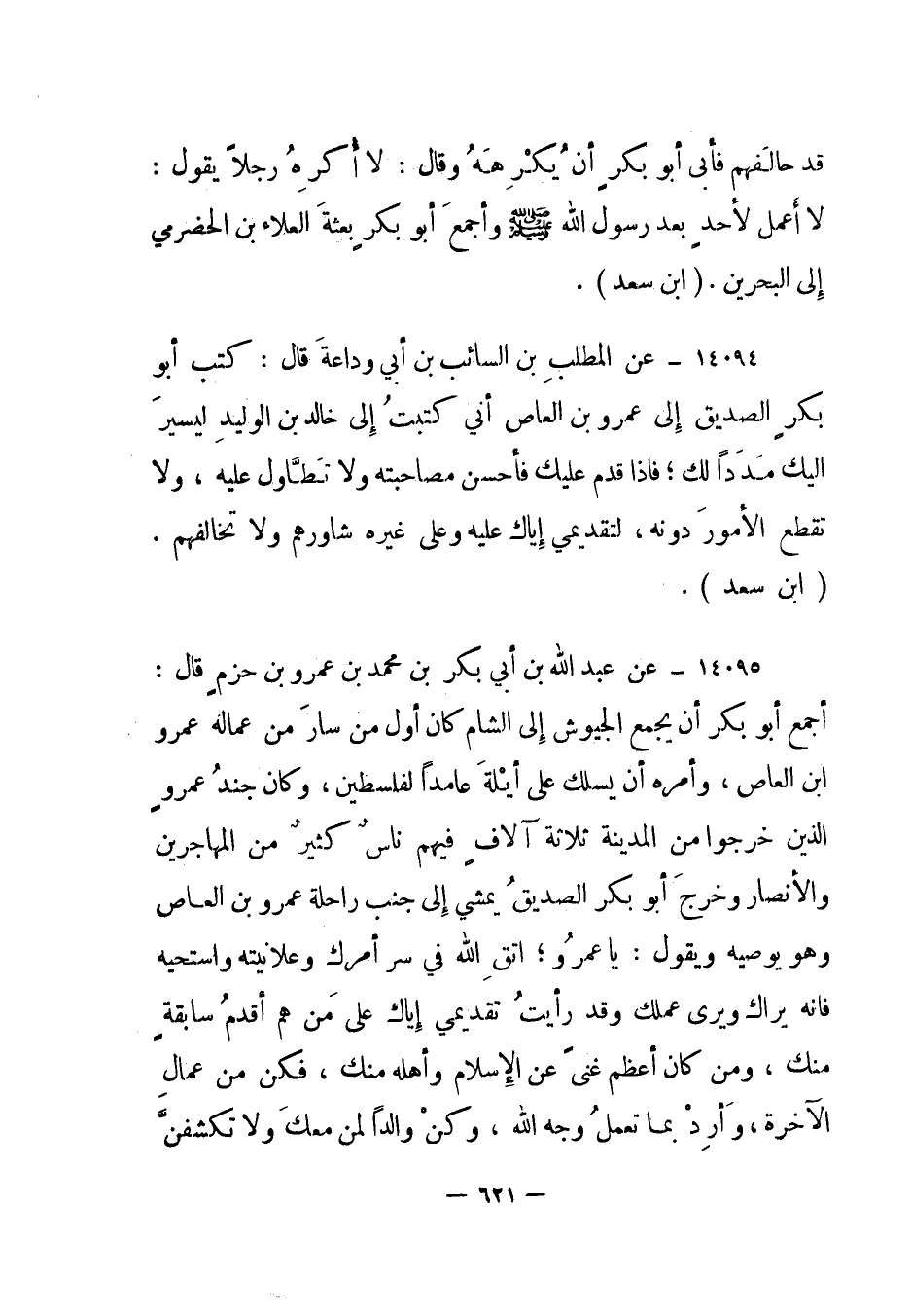 14095- عن عبد الله بن أبي بكر بن محمد بن عمرو بن حزم قال: أجمع أبو بكر أن يجمع الجيوش إلى الشام كان أول من سار من عماله عمرو بن العاص، وامره أن يسلك على أيلة عامدا لفلسطين، وكان جند عمرو الذين خرجوا من المدينة ثلاثة آلاف فيهم ناس كثير من المهاجرين والأنصار وخرج أبو بكر الصديق يمشي إلى جنب راحلة عمرو بن العاص وهو يوصيه ويقول: يا عمرو؛ اتق الله في سر أمرك وعلانيته واستحيه فإنه يراك ويرى عملك وقد رأيت تقديمي إياك على من هم أقدم سابقة منك، ومن كان أعظم غنى عن الإسلام وأهله منك، فكن من عمال الآخرة، وأرد بما تعمل وجه الله، وكن والدا لمن معك ولا تكشفن