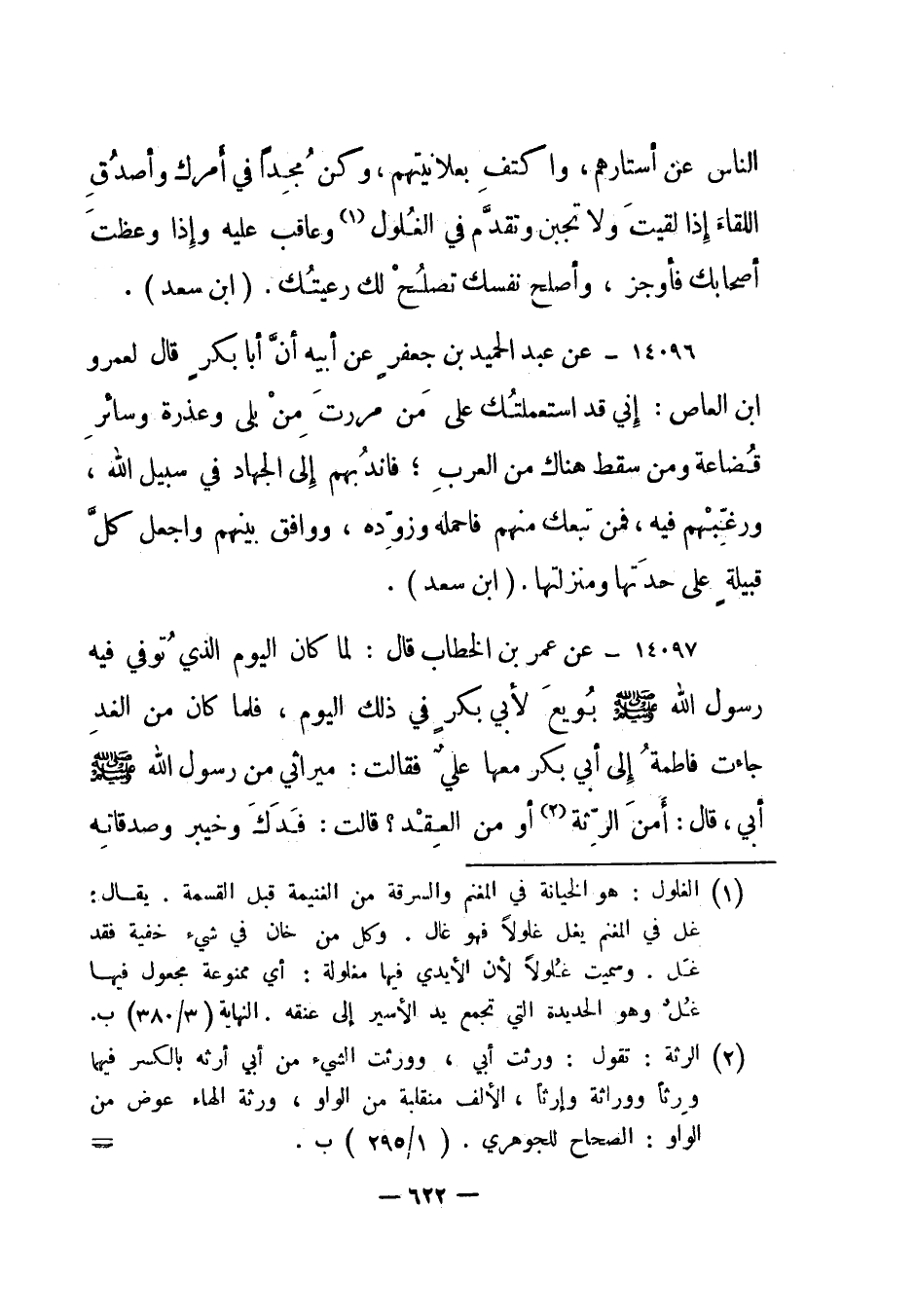 14097- عن عمر بن الخطاب قال: لما كان اليوم الذي توفي فيه رسول الله صلى الله عليه وسلم بويع لأبي بكر في ذلك اليوم، فلما كان من الغد جاءت فاطمة إلى أبي بكر معها علي فقالت: ميراثي من رسول الله صلى الله عليه وسلم أبي، قال: أمن الرثة2 أو من العقد؟ قالت: فدك وخيبر وصدقاته