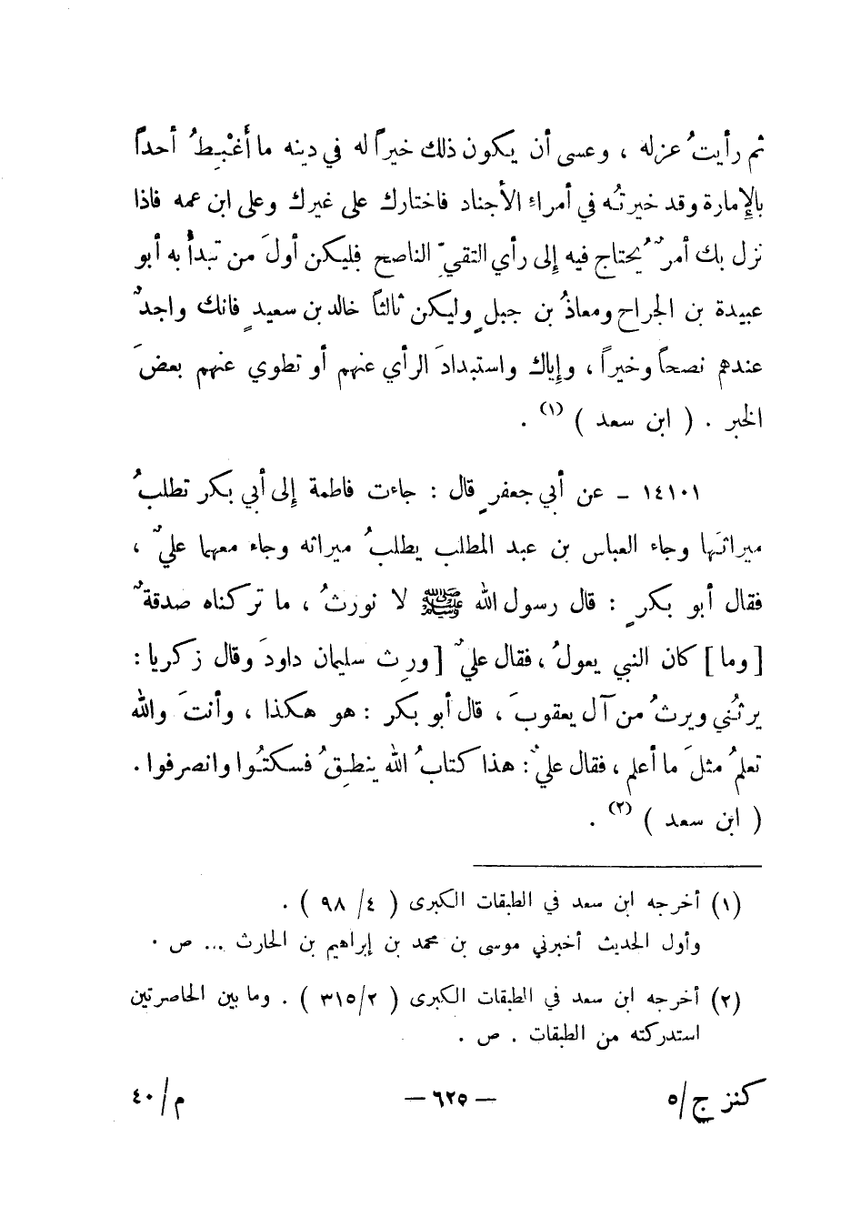 14101- عن أبي جعفر قال: جاءت فاطمة إلى أبي بكر تطلب ميراثها وجاء العباس بن عبد المطلب يطلب ميراثه وجاء معهما علي، فقال أبو بكر: قال رسول الله صلى الله عليه وسلم لا نورث، ما تركناه صدقة [وما] كان النبي يعول، فقال علي: ورث سليمان داود وقال زكريا: يرثني ويرث من آل يعقوب، قال أبو بكر: هو هكذا، وأنت والله تعلم مثل ما أعلم، فقال علي: هذا كتاب الله ينطق فسكتوا وانصرفوا. "ابن سعد"2