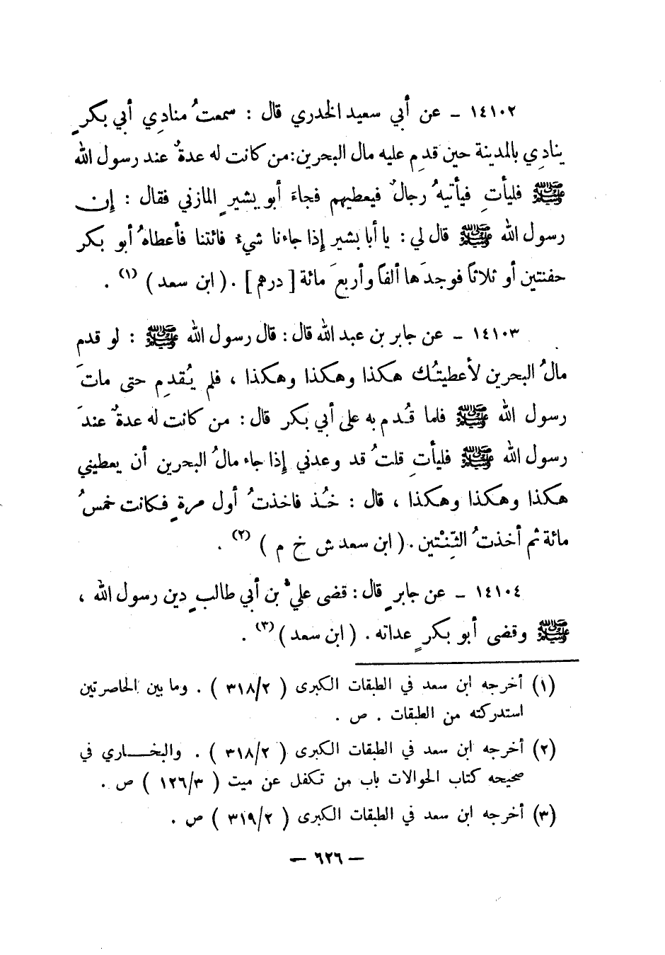 14102- عن أبي سعيد الخدري قال: سمعت منادي أبي بكر ينادي بالمدينة حين قدم عليه مال البحرين: من كانت له عدة عند رسول الله صلى الله عليه وسلم فليأت فيأتيه رجال فيعطيهم فجاء أبو بشير المازني فقال: إن رسول الله صلى الله عليه وسلم قال لي: يا أبا بشير إذا جاءنا شيء فائتنا فأعطاه أبو بكر حفنتين أو ثلاثا فوجدها ألفا وأربع مائة [درهم] . "ابن سعد"1