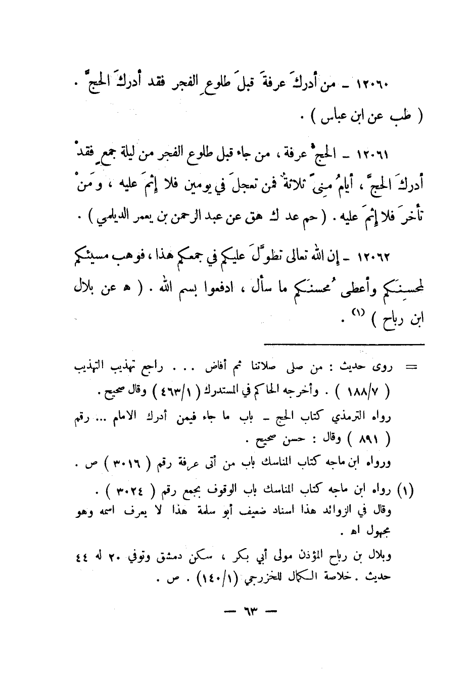 12060- من أدرك عرفة قبل طلوع الفجر فقد أدرك الحج. "طب عن ابن عباس".
