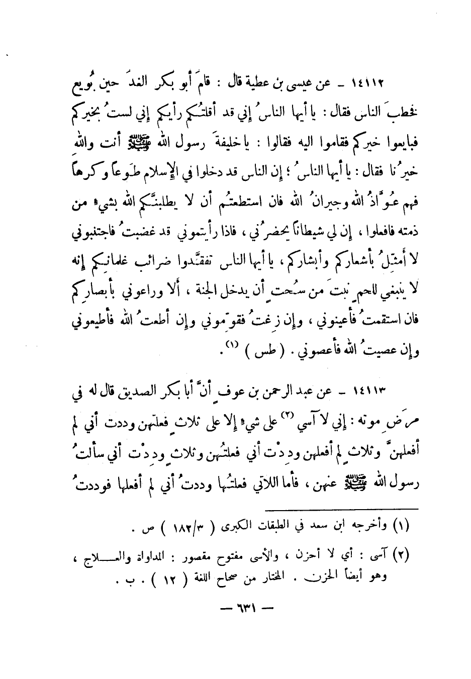 14112- عن عيسى بن عطية قال: قام أبو بكر الغد حين بويع فخطب الناس فقال: يا أيها الناس إني قد أقلتكم رأيكم إني لست بخيركم فبايعوا خيركم فقاموا إليه فقالوا: يا خليفة رسول الله صلى الله عليه وسلم أنت والله خيرنا فقال: يا أيها الناس؛ إن الناس قد دخلوا في الإسلام طوعا وكرها فهم عواذ الله وجيران الله فإن استطعتم أن لا يطلبنكم الله بشيء من ذمته فافعلوا، إن لي شيطانا يحضرني، فإذا رأيتموني قد غضبت فاجتنبوني لا أمثل بأشعاركم وأبشاركم، يا أيها الناس تفقدوا ضرائب غلمانكم إنه لا ينبغي للحم نبت من سحت أن يدخل الجنة، ألا وراعوني بأبصاركم فإن استقمت فأعينوني، وإن زغت فقوموني وإن أطعت الله فأطيعوني وإن عصيت الله فأعصوني. "طس"1