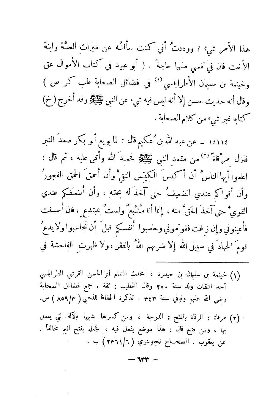 "أبو عبيد في كتاب الأموال عق وخيثمة بن سليمان الأطرابلسي1 في فضائل الصحابة طب كر ص" وقال أنه حديث حسن إلا أنه ليس فيه شيء عن النبي صلى الله عليه وسلم وقد أخرج "خ" كتابه غير شيء من كلام الصحابة.