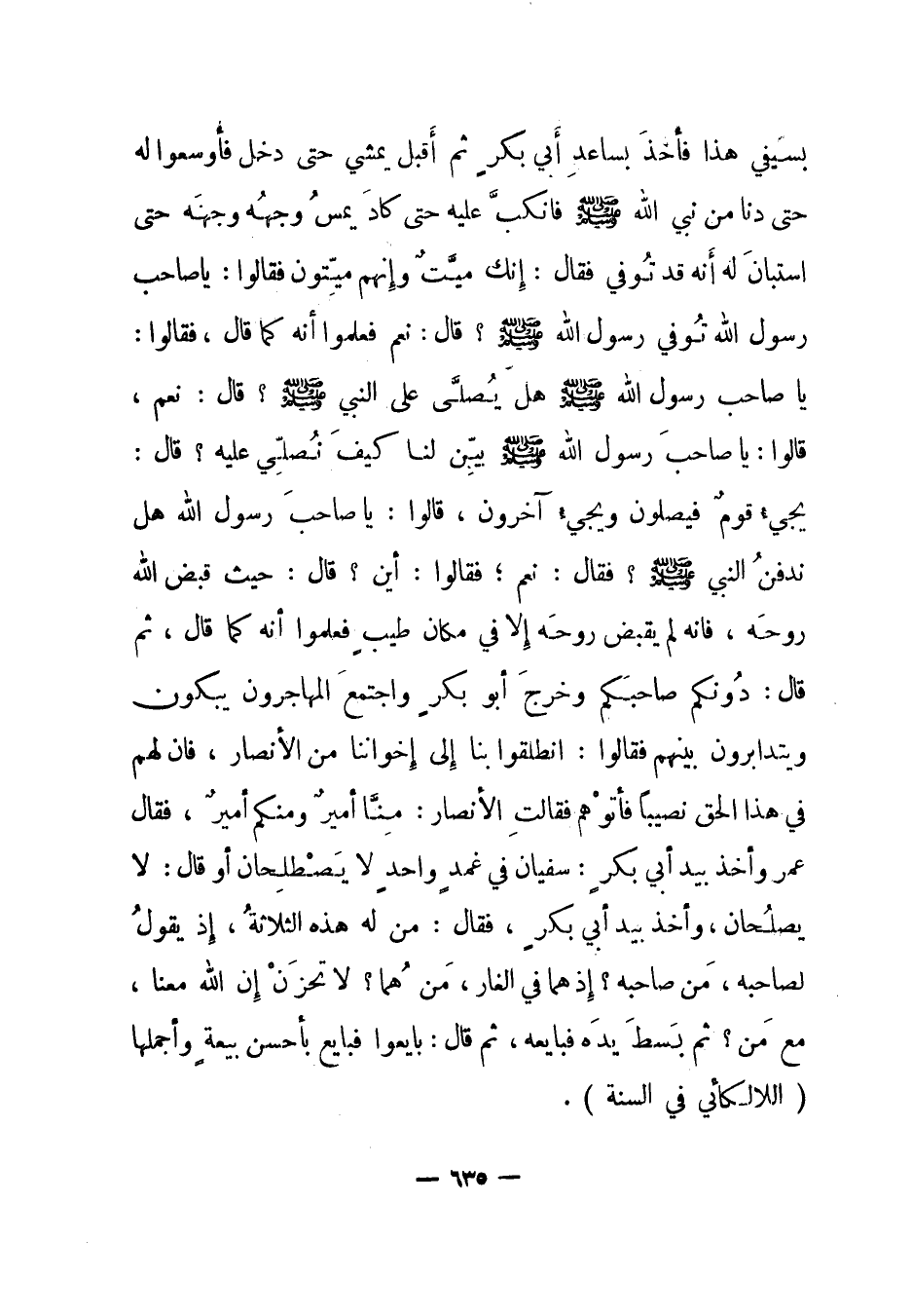 بسيفي هذا فأخذ بساعد أبي بكر ثم أقبل يمشي حتى دخل فأوسعوا له حتى دنا من نبي الله صلى الله عليه وسلم فانكب عليه حتى كاد يمس وجهه وجهه حتى استبان له أنه قد توفي فقال: إنك ميت وإنهم ميتون فقالوا: يا صاحب رسول الله توفي رسول الله صلى الله عليه وسلم؟ قال: نعم فعلموا أنه كما قال، فقالوا: يا صاحب رسول الله صلى الله عليه وسلم هل يصلى على النبي صلى الله عليه وسلم؟ قال: نعم، قالوا: يا صاحب رسول الله صلى الله عليه وسلم بين لنا كيف نصلي عليه؟ قال: يجيء قوم فيصلون ويجيء آخرون، قالوا: يا صاحب رسول الله هل ندفن النبي صلى الله عليه وسلم؟ فقال: نعم؛ فقالوا: أين؟ قال: حيث قبض الله روحه، فإنه لم يقبض روحه إلا في مكان طيب فعلموا أنه كما قال، ثم قال: دونكم صاحبكم وخرج أبو بكر واجتمع المهاجرون يبكون ويتدابرون بينهم فقالوا: انطلقوا بنا إلى إخواننا من الأنصار، فإن لهم في هذا الحق نصيبا فأتوهم فقالت الأنصار: منا أمير ومنكم أمير، فقال عمر وأخذ بيد أبي بكر: سفيان في غمد واحد لا يصطلحان أو قال: لا يصلحان، وأخذ بيد أبي بكر، فقال: من له هذه الثلاثة، إذ يقول لصاحبه، من صاحبه؟ إذ هما في الغار، من هما؟ لا تحزن إن الله معنا، مع من؟ ثم بسط يده فبايعه، ثم قال: بايعوا فبايع بأحسن بيعة وأجملها. "اللالكائي في السنة".