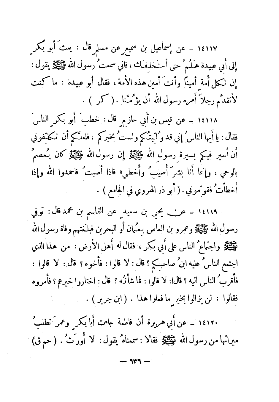 14117- عن إسماعيل بن سميع عن مسلم قال: بعث أبو بكر إلى أبي عبيدة هلم حتى أستخلفك، فإني سمعت رسول الله صلى الله عليه وسلم يقول: إن لكل أمة أمينا وأنت أمين هذه الأم ة، فقال أبو عبيدة: ما كنت لأتقدم رجلا أمره رسول الله أن يؤمنا. "كر".