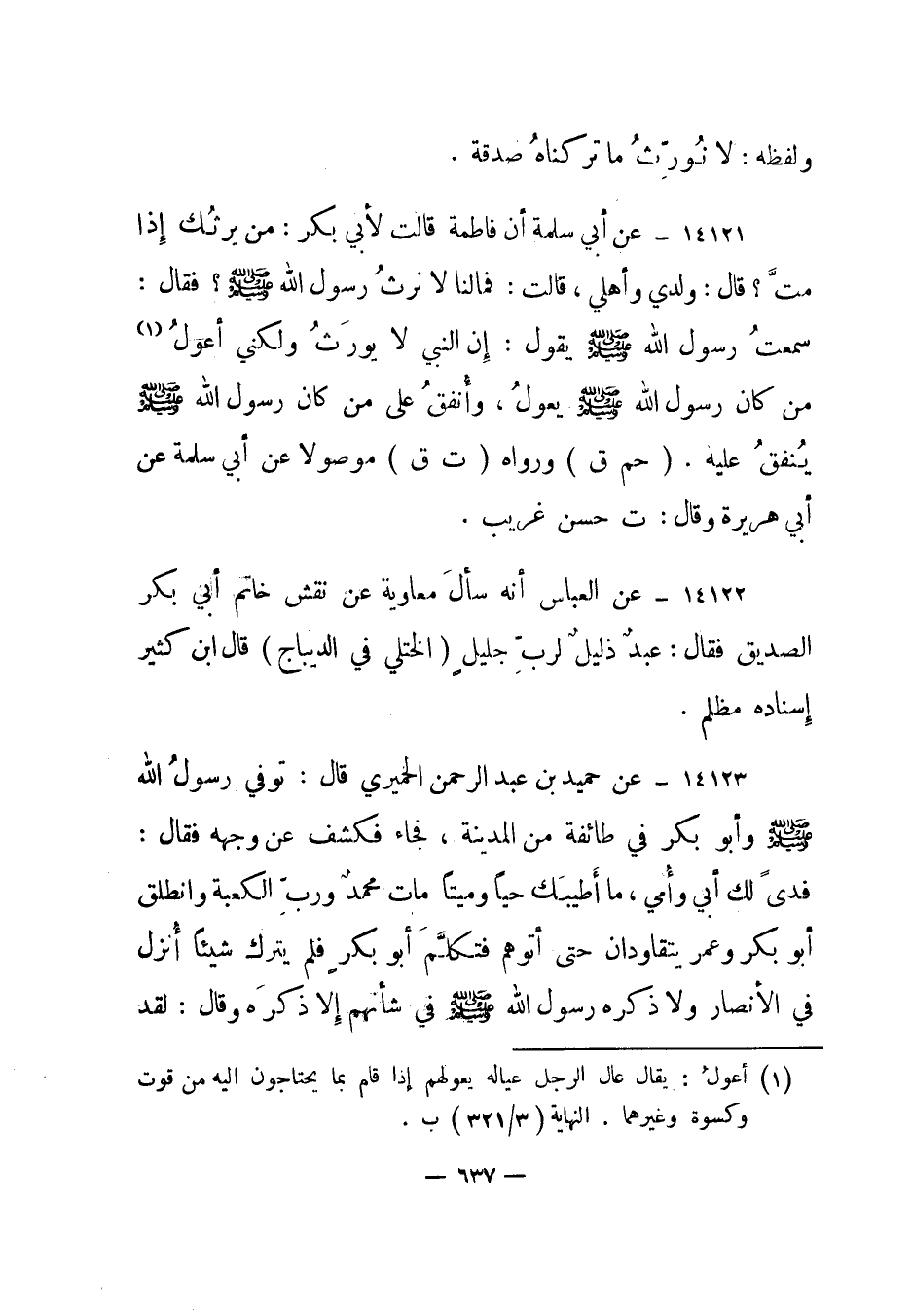 14121- عن أبي سلمة أن فاطمة قالت لأبي بكر: من يرثك إذا مت؟ قال: ولدي وأهلي، قالت: فما لنا لا نرث رسول الله صلى الله عليه وسلم؟ فقال: سمعت رسول الله صلى الله عليه وسلم يقول: إن النبي لا يورث ولكني أعول1 من كان رسول الله صلى الله عليه وسلم يعول، وأنفق على من كان رسول الله صلى الله عليه وسلم ينفق عليه."حم ق" ورواه "ت ق" موصولا عن أبي سلمة عن أبي هريرة وقال: ت حسن غريب.