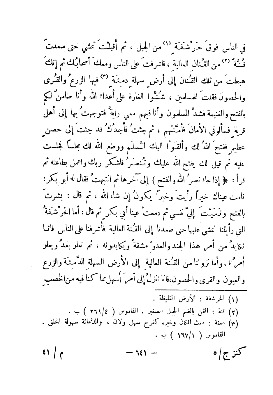 في الناس فوق حرشفة1 من الجبل ثم أقبلت تمشي حتى صعدت قنة2 من القنان العالية، فأشرفت على الناس ومعك أصحابك ثم إنك هبطت من تلك القنان إلى أرض سهلة دمثة3 فيها الزرع والقرى والحصون فقلت للمسلمين، شنوا الغارة على أعداء الله وأنا ضامن لكم بالفتح والغنيمة فشد المسلمون وأنا فيهم معي راية فتوجهت بها إلى أهل قرية فسألوني الأمان فأمنتهم، ثم جئت فأجدك قد جئت إلى حصن عظيم ففتح الله لك وألقوا إليك السلم ووضع الله لك مجلسا فجلست عليه ثم قيل لك يفتح الله عليك وتنصر فاشكر ربك واعمل بطاعته ثم قرأ: {إِذَا جَاءَ نَصْرُ اللَّهِ وَالْفَتْحُ} إلى آخرها ثم انتبهت فقال له أبو بكر: نامت عيناك خيرا رأيت وخيرا يكون إن شاء الله. ثم قال: بشرت بالفتح ونعيت إلي نفسي ثم دمعت عينا أبي بكر ثم قال: أما الحرشفة التي رأيتنا نمشي عليها حتى صعدنا إلى القنة العالية فأشرفنا على الناس فإنا نكابد من أمر هذا الجند والعدو مشقة ويكابدونه، ثم نعلو بعد ويعلو أمرنا، وأما نزولنا من القنة العالية إلى الأرض السهلة الدمثة والزرع والعيون والقرى والحصون، فإنا ننزل إلى أمر أسهل مما كنا فيه من الخصب