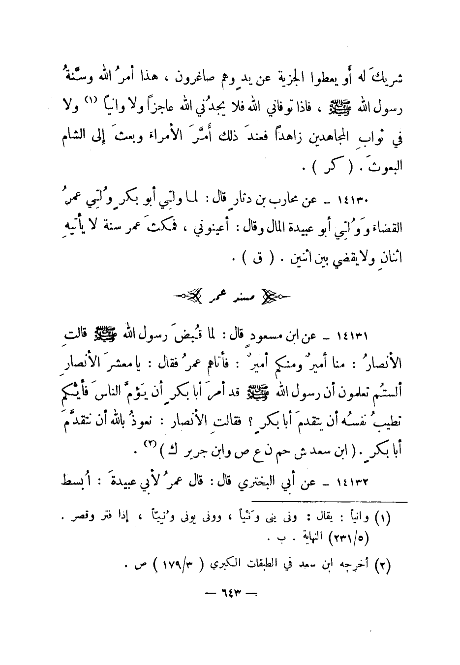14131- عن ابن مسعود قال: لما قبض رسول الله صلى الله عليه وسلم قالت الأنصار: منا أمير ومنكم أمير. فأتاهم عمر فقال: يا معشر الأنصار ألستم تعلمون أن رسول الله صلى الله عليه وسلم قد أمر أبا بكر أن يؤم الناس فأيكم تطيب نفسه أن يتقدم أبا بكر؟ فقالت الأنصار: نعوذ بالله أن نتقدم أبا بكر. "ابن سعد ش حم ن ع ص وابن جرير ك"2