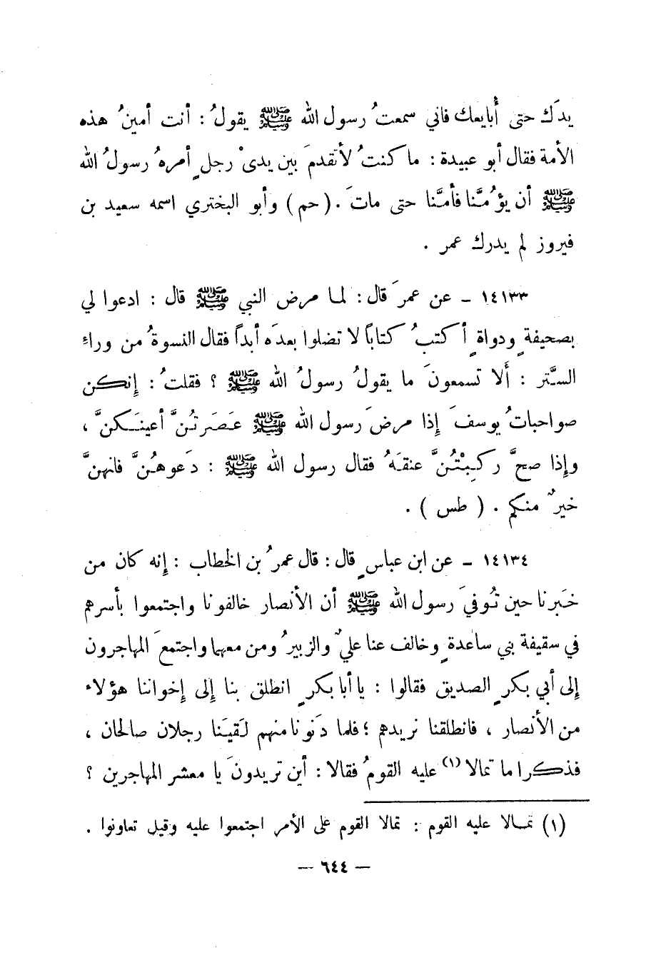 14134- عن ابن عباس قال: قال عمر بن الخطاب: إنه كان من خبرنا حين توفي رسول الله صلى الله عليه وسلم أن الأنصار خالفونا واجتمعوا بأسرهم في سقيفة بني ساعدة وخالف عنا علي والزبير ومن معهما واجتمع المهاجرون إلى أبي بكر الصديق فقالوا: يا أبا بكر انطلق بنا إلى إخواننا هؤلاء من الأنصار، فانطلقنا نريدهم؛ فلما دنونا منهم لقينا رجلان صالحان، فذكرا ما تمالا1 عليه القوم فقالا: أين تريدون يا معشر المهاجرين؟