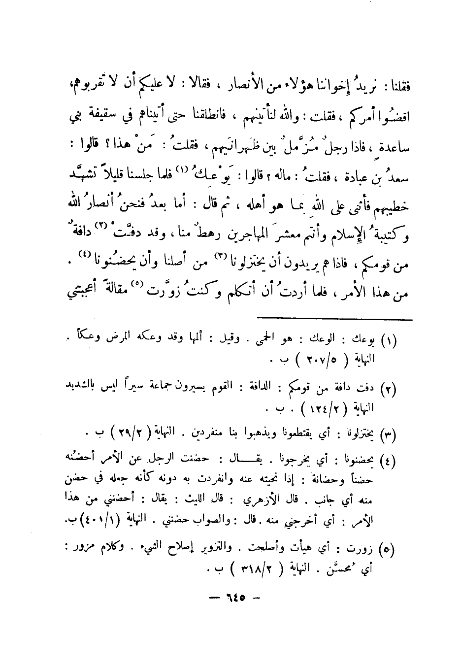 فقلنا: نريد إخواننا هؤلاء من الأنصار، فقالا: لا عليكم أن لا تقربوهم، اقضوا أمركم، فقلت: والله لنأتينهم، فانطلقنا حتى أتيناهم في سقيفة بني ساعدة، فإذا رجل مزمل بين ظهرانيهم، فقلت: من هذا؟ قالوا: سعد بن عبادة، فقلت: ماله؟ قالوا: يوعك1 فلما جلسنا قليلا تشهد خطيبهم فأثنى على الله بما هو أهله، ثم قال: أما بعد فنحن أنصار الله وكتيبة الإسلام وأنتم معشر المهاجرين رهط منا، وقد دفت2 دافة من قومكم، فإذا هم يريدون أن يختزلونا3 من أصلنا وأن يحضنونا4 من هذا الأمر. فلما أردت أن أتكلم وكنت زورت5 مقالة أعجبتني