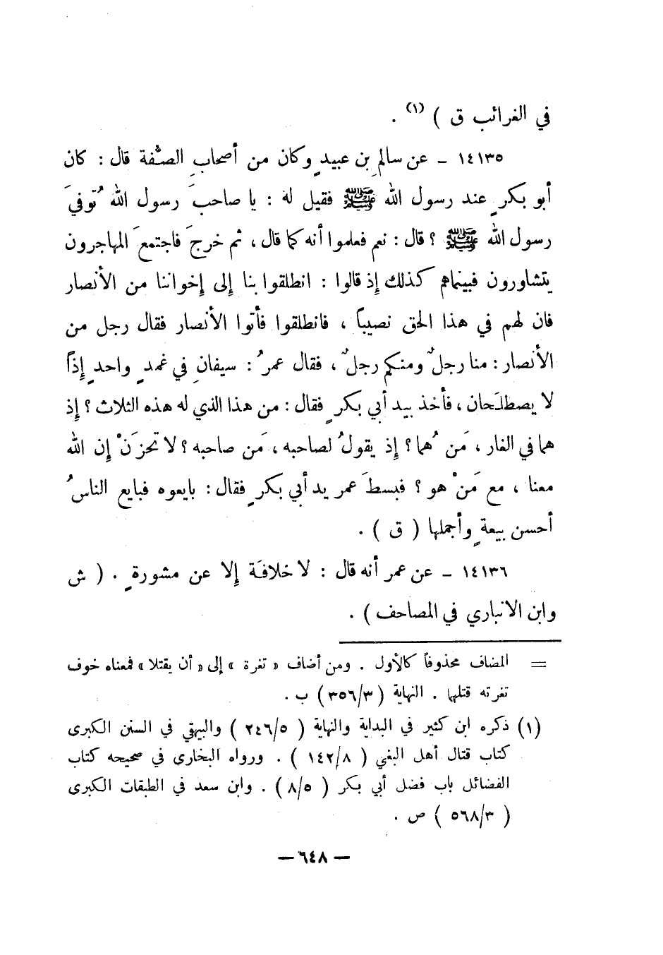 14135- عن سالم بن عبيد وكان من أصحاب الصفة قال: كان أبو بكر عند رسول الله صلى الله عليه وسلم فقيل له: يا صاحب رسول الله توفي رسول الله صلى الله عليه وسلم؟ قال: نعم فعلموا أنه كما قال، ثم خرج فاجتمع المهاجرون يتشاورون فبينما هم كذلك إذ قالوا: انطلقوا بنا إلى أخواننا من الأنصار فإن لهم في هذا الحق نصيبا، فانطلقوا فأتوا الأنصار فقال رجل من الأنصار: منا رجل ومنكم رجل، فقال عمر: سيفان في غمد واحد إذا لا يصطلحان، فأخذ بيد أبي بكر فقال: من هذا الذي له هذه الثلاث؟ إذ هما في الغار، من هما؟ إذ يقول لصاحبه، من صاحبه؟ لا تحزن إن الله معنا، مع من هو؟ فبسط عمر يد أبي بكر فقال: بايعوه فبايع الناس أحسن بيعة وأجملها. "ق".