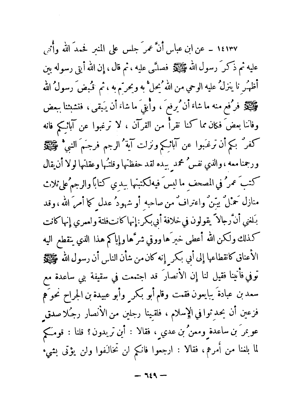 14137- عن ابن عباس أن عمر جلس على المنبر فحمد الله وأثنى عليه ثم ذكر رسول الله صلى الله عليه وسلم فصلى عليه، ثم قال، إن الله أبقى رسوله بين أظهرنا ينزل عليه الوحي من الله يحل به ويحرم به، ثم قبض رسول الله صلى الله عليه وسلم فرفع منه ما شاء أن يرفع، وأبقي ما شاء أن يبقى، فتشبثنا ببعض وفاتنا بعض فكان مما كنا نقرأ من القرآن، لا ترغبوا عن آبائكم فإنه كفر بكم أن ترغبوا عن آبائكم ونزلت آية الرجم فرجم النبي صلى الله عليه وسلم ورجمنا معه، والذي نفس محمد بيده لقد حفظتها وقلتها وعقلتها لولا أن يقال كتب عمر في المصحف ما ليس فيه لكتبتها بيدي كتابا والرجم على ثلاث منازل حمل بين واعتراف من صاحبه أو شهود عدل كما أمر الله، وقد بلغني أن رجالا يقولون في خلافة أبي بكر: إنها كانت فلتة ولعمري إنها كانت كذلك ولكن الله أعطى خيرها ووقي شرها وإياكم هذا الذي ينقطع إليه الأعناق كانقطاعها إلى أبي بكر إنه كان من شأن الناس أن رسول الله صلى الله عليه وسلم توفي فأتينا فقيل لنا إن الأنصار قد اجتمعت في سقيفة بني ساعدة مع سعد بن عبادة يبايعون فقمت وقام أبو بكر وأبو عبيدة بن الجراح نحوهم فزعين أن يحدثوا في الإسلام، فلقينا رجلين من الأنصار رجلا صدق عويمر بن ساعدة ومعن بن عدي، فقالا: أين تريدون؟ قلنا: قومكم لما بلغنا من أمرهم، فقالا: ارجعوا فإنكم لن تخالفوا ولن يؤتى بشيء
