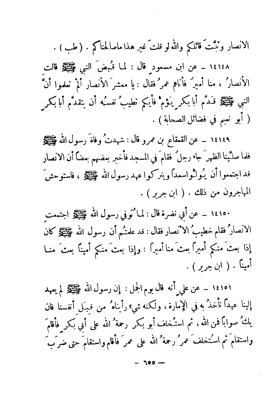 14148- عن ابن مسعود قال: لما قبض النبي صلى الله عليه وسلم قالت الأنصار، منا أمير فأتاهم عمر فقال: يا معشر الأنصار ألم تعلموا أن النبي صلى الله عليه وسلم قدم أبا بكر يؤم فأيكم تطيب نفسه أن يتقدم أبا بكر. "أبو نعيم في فضائل الصحابة".