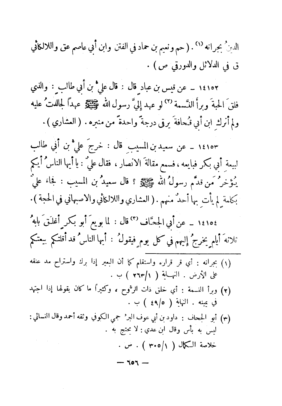 14153- عن سعيد بن المسيب قال: خرج علي بن أبي طالب لبيعة أبي بكر فبايعه، فسمع مقالة الأنصار، فقال علي: يا أيها الناس أيكم يؤخر من قدم رسول الله صلى الله عليه وسلم؟ قال سعيد بن المسيب: فجاء علي بكلمة لم يأت بها أحد منهم. "العشاري واللالكائي والأصبهاني في الحجة".