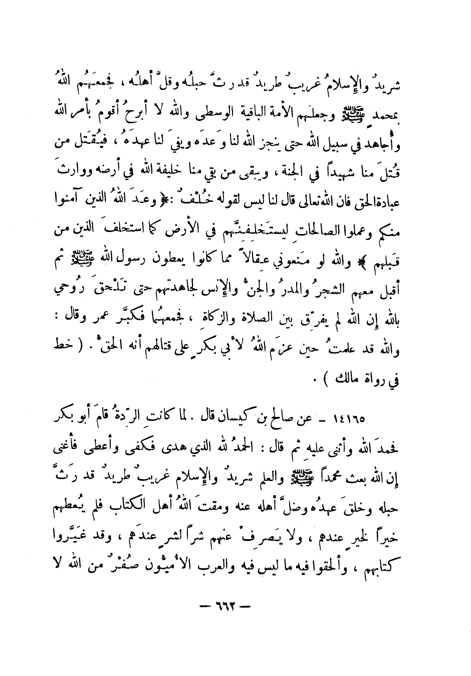 14165- عن صالح بن كيسان قال: لما كانت الردة قام أبو بكر فحمد الله وأثنى عليه ثم قال: الحمد لله الذي هدى فكفى وأعطى فأغنى إن الله بعث محمدا صلى الله عليه وسلم والعلم شريد والإسلام غريب طريد قد رث حبله وخلق عهده وضل أهله عنه ومقت الله أهل الكتاب فلم يعطهم خيرا لخير عندهم، ولا يصرف عنهم شرا لشر عندهم، وقد غيروا كتابهم، وألحقوا فيه ما ليس فيه والعرب الأميون صفر من الله لا