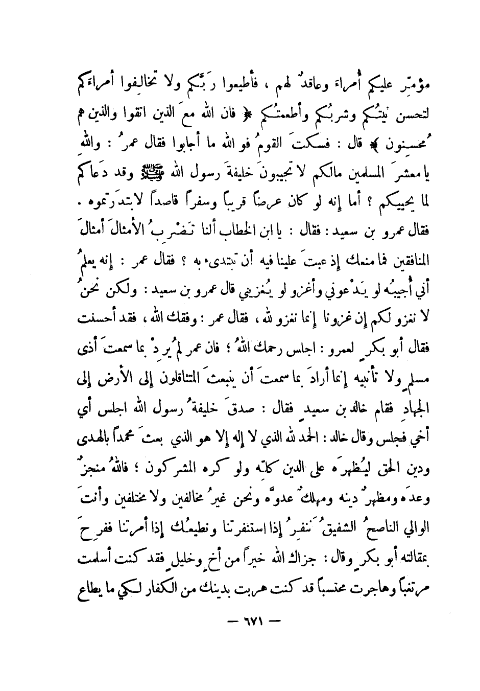 مؤمر عليكم أمراء وعاقد لهم، فأطيعوا ربكم ولا تخالفوا أمراءكم لتحسن نيتكم وشربكم وأطعمتكم {إِنَّ اللَّهَ مَعَ الَّذِينَ اتَّقَوْا وَالَّذِينَ هُمْ مُحْسِنُونَ} . قال: فسكت القوم فوالله ما أجابوا فقال عمر: والله يا معشر المسلمين مالكم لا تجيبون خليفة رسول الله صلى الله عليه وسلم وقد دعاكم لما يحييكم؟ أما إنه لو كان عرضا قريبا وسفرا قاصدا لابتدرتموه. فقال عمرو بن سعيد: فقال: يا ابن الخطاب ألنا تضرب الأمثال أمثال المنافقين فما منعك إذ عبت علينا فيه أن تبتدئ به؟ فقال عمر: إنه يعلم أني أجيبه لو يدعوني وأغزو لو يغزيني قال عمرو بن سعيد: ولكن نحن لا نغزو لكم إن غزونا إنما نغزو لله، فقال عمر: وفقك الله، فقد أحسنت فقال أبو بكر لعمرو: اجلس رحمك الله؛ فإن عمر لم يرد بما سمعت أذى مسلم ولا تأنيبه إنما أراد بما سمعت أن ينبعث المتثاقلون إلى الأرض إلى الجهاد فقام خالد بن سعيد فقال: صدق خليفة رسول الله اجلس أي أخي فجلس وقال خالد: الحمد لله الذي لا إله إلا هو الذي بعث محمدا بالهدى ودين الحق ليظهره على الدين كله ولو كره المشركون؛ فالله منجز وعده ومظهر دينه ومهلك عدوه ونحن غير مخالفين ولا مختلفين وأنت الوالي الناصح الشفيق ننفر إذا استنفرتنا ونطيعك إذا أمرتنا ففرح بمقالته أبو بكر وقال: جزاك الله خيرا من أخ وخليل فقد كنت أسلمت مرتغبا وهاجرت محتسبا قد كنت هربت بدينك من الكفار لكي ما يطاع