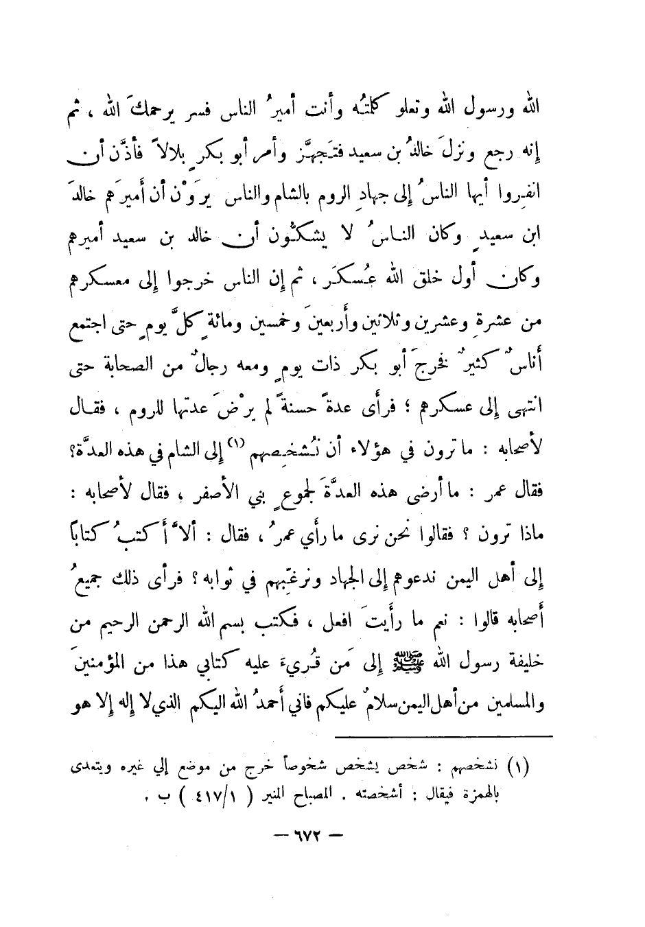 الله ورسول الله وتعلو كلمته وأنت أمير الناس فسر يرحمك الله. ثم إنه رجع ونزل خالد بن سعيد فتجهز وأمر أبو بكر بلالا فأذن أن انفروا أيها الناس إلى جهاد الروم بالشام والناس يرون أن أميرهم خالد بن سعيد وكان الناس لا يشكون أن خالد بن سعيد أميرهم وكان أول خلق الله عسكر، ثم إن الناس خرجوا إلى معسكرهم من عشرة وعشرين وثلاثين وأربعين وخمسين ومائة كل يوم حتى اجتمع أناس كثير فخرج أبو بكر ذات يوم ومعه رجال من الصحابة حتى انتهى إلى عسكرهم؛ فرأى عدة حسنة لم يرض عدتها للروم، فقال لأصحابه: ما ترون في هؤلاء أن نشخصهم1 إلى الشام في هذه العدة؟ فقال عمر: ما أرضى هذه العدة لجموع بني الأصفر، فقال لأصحابه: ماذا ترون؟ فقالوا نحن نرى ما رأي عمر، فقال: ألا أكتب كتابا إلى أهل اليمن ندعوهم إلى الجهاد ونرغبهم في ثوابه؟ فرأى ذلك جميع أصحابه قالوا: نعم ما رأيت افعل، فكتب بسم الله الرحمن الرحيم من خليفة رسول الله صلى الله عليه وسلم إلى من قريء عليه كتابي هذا من المؤمنين والمسلمين من أهل اليمن سلام عليكم فإني أحمد الله إليكم الذي لا إله إلا هو