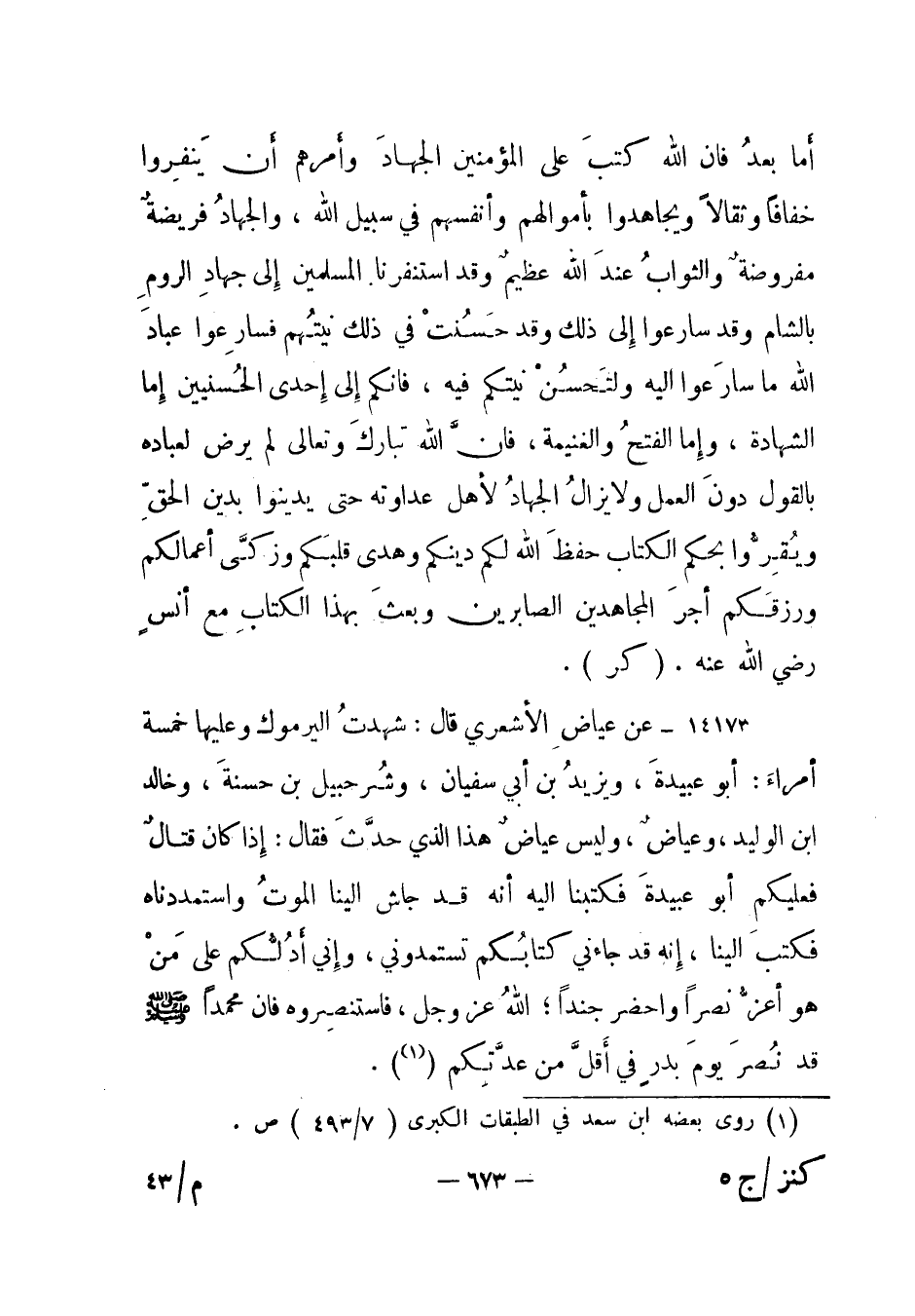 أما بعد فإن الله كتب على المؤمنين الجهاد وأمرهم أن ينفروا خفافا وثقالا ويجاهدوا بأموالهم وأنفسهم في سبيل الله، والجهاد فريضة مفروضة والثواب عند الله عظيم وقد استنفرنا المسلمين إلى جهاد الروم بالشام وقد سارعوا إلى ذلك وقد حسنت في ذلك نيتهم فسارعوا عباد الله ما سارعوا إليه ولتحسن نيتكم فيه، فإنكم إلى إحدى الحسنيين إما الشهادة، وإما الفتح والغنيمة، فإن الله تبارك وتعالى لم يرض لعباده بالقول دون العمل ولا يزال الجهاد لأهل عداوته حتى يدينوا بدين الحق ويقروا بحكم الكتاب حفظ الله لكم دينكم وهدى قلبكم وزكى أعمالكم ورزقكم أجر المجاهدين الصابرين وبعث بهذا الكتاب مع أنس رضي الله عنه. "كر".