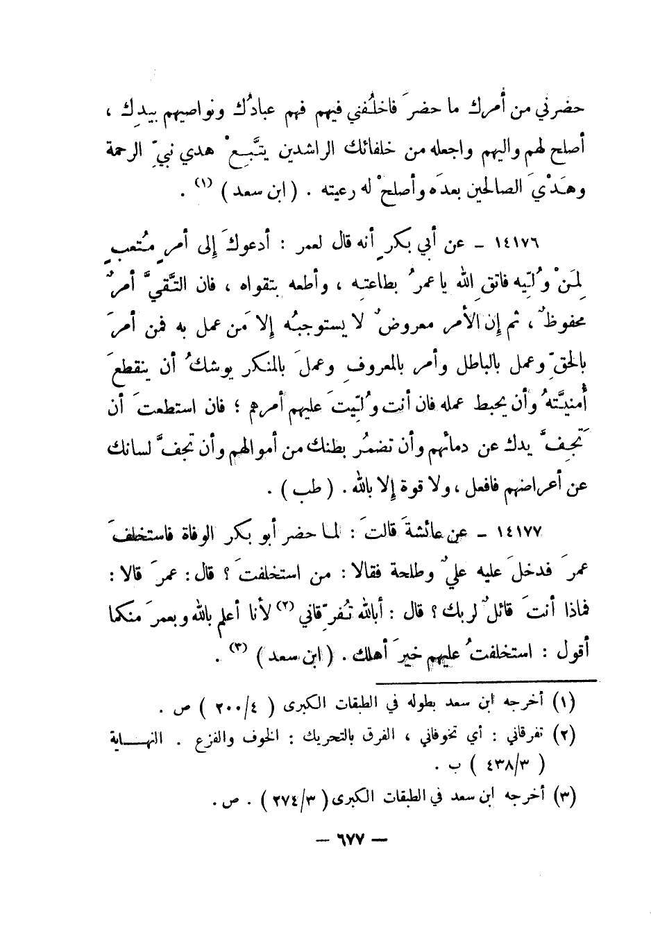 14177- عن عائشة قالت: لما حضر أبو بكر الوفاة فاستخلف عمر فدخل عليه علي وطلحة فقالا: من استخلفت؟ قال: عمر قالا: فماذا أنت قائل لربك؟ قال: أبالله تفرقاني2 لأنا أعلم بالله وبعمر منكما أقول: استخلفت عليهم خير أهلك. "ابن سعد"3