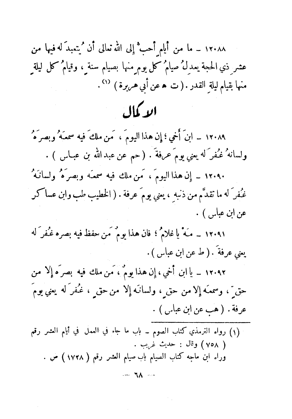 12092- يا ابن أخي، إن هذا يوم، من ملك فيه بصره إلا من حق، وسمعه إلا من حق، ولسانه إلا من حق، غفر له يعني يوم عرفة. "هب عن ابن عباس".
