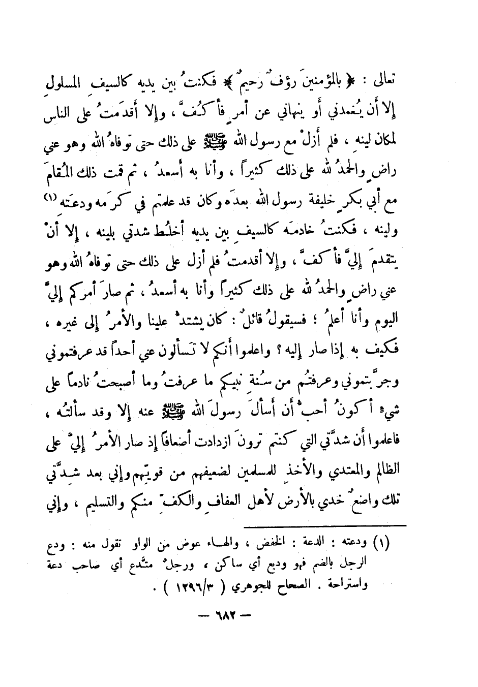 تعالى: {بِالْمُؤْمِنِينَ رَؤُوفٌ رَحِيمٌ} فكنت بين يديه كالسيف المسلول إلا أن يغمدني أو ينهاني عن أمر فأكف، وإلا أقدمت على الناس لمكان لينه، فلم أزل مع رسول الله صلى الله عليه وسلم على ذلك حتى توفاه الله وهو عني راض والحمد لله على ذلك كثيرا، وأنا به أسعد، ثم قمت ذلك المقام مع أبي بكر خليفة رسول الله بعده وكان قد علمتم في كرمه ودعته1 ولينه، فكنت خادمه كالسيف بين يديه أخلط شدتي بلينه، إلا أن يتقدم إلي فأكف، وإلا أقدمت فلم أزل على ذلك حتى توفاه الله وهو عني راض والحمد لله على ذلك كثيرا وأنا به أسعد، ثم صار أمركم إلي اليوم وأنا أعلم؛ فسيقول قائل: كان يشتد علينا والأمر إلى غيره، فكيف به إذا صار إليه؟ واعلموا أنكم لا تسألون عني أحدا قد عرفتموني وجربتموني وعرفتم من سنة نبيكم ما عرفت وما أصبحت نادما على شيء أكون أحب أن أسأل رسول الله صلى الله عليه وسلم عنه إلا وقد سألته، فاعلموا أن شدتي التي كنتم ترون ازدادت أضعافا إذ صار الأمر إلي على الظالم والمعتدي والأخذ للمسلمين لضعيفهم من قويهم وإني بعد شدتي تلك واضع خدي بالأرض لأهل العفاف والكف منكم والتسليم، وإني