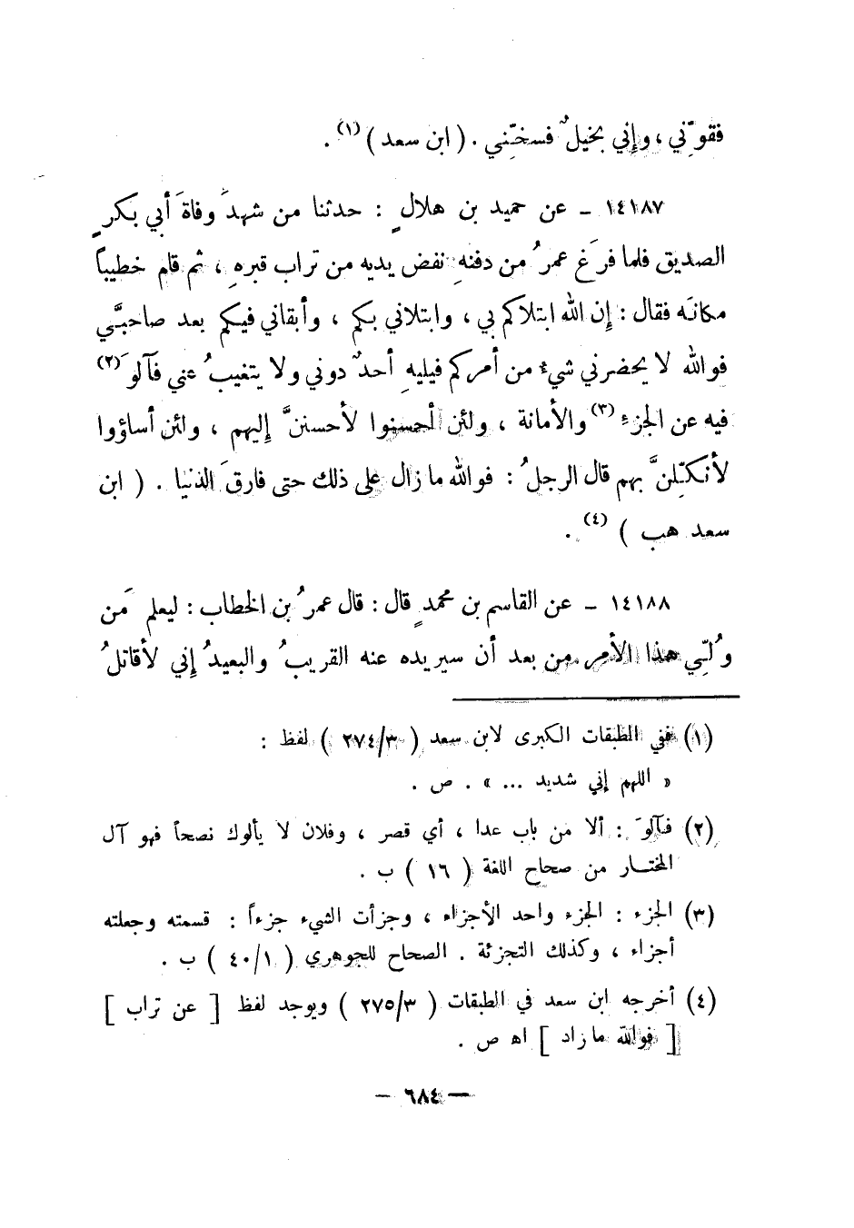 14187- عن حميد بن هلال: حدثنا من شهد وفاة أبي بكر الصديق فلما فرغ عمر من دفنه نفض يديه من تراب قبره، ثم قام خطيبا مكانه فقال: إن الله ابتلاكم بي، وابتلاني بكم، وأبقاني فيكم بعد صاحبي فوالله لا يحضرني شيء من أمركم فيليه أحد دوني ولا يتغيب عني فآلو2 فيه عن الجزء3 والأمانة، ولئن أحسنوا لأحسنن إليهم، ولئن أساؤوا لأنكلن بهم قال الرجل: فوالله ما زال على ذلك حتى فارق الدنيا. "ابن سعد هب"4