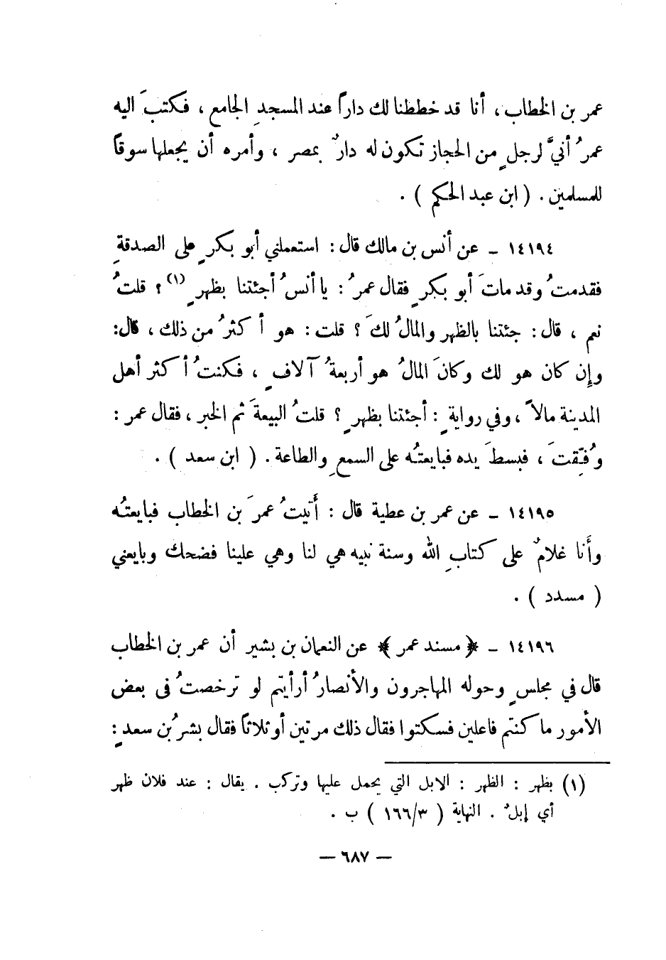 14194- عن أنس بن مالك قال: استعملني أبو بكر على الصدقة فقدمت وقد مات أبو بكر فقال عمر: يا أنس أجئتنا بظهر1 قلت: نعم، قال: جئتنا بالظهر والمال لك؟ قلت: هو أكثر من ذلك، قال: وإن كان هو لك وكان المال هو أربعة آلاف، فكنت أكثر أهل المدينة مالا، وفي رواية: أجئتنا بظهر؟ قلت: البيعة ثم الخبر، فقال عمر: وفقت، فبسط يده فبايعته على السمع والطاعة. "ابن سعد".