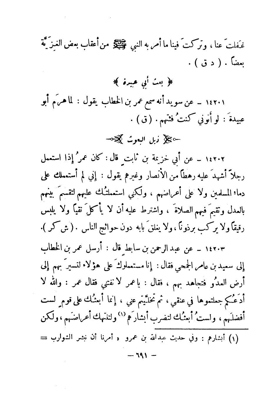 14203- عن عبد الرحمن بن سابط قال: أرسل عمر بن الخطاب إلى سعيد بن عامر الجمحي فقال: إنا مستعملوك على هؤلاء لتسير بهم إلى أرض العدو فتجاهد بهم، فقال: يا عمر لا تفتني فقال عمر: والله لا أدعكم جعلتموها في عنقي، ثم تخليتم عني، إنما أبعثك على قوم لست أفضلهم، ولست أبعثك لتضرب أبشارهم1 ولتنتهك أعراضهم، ولكن