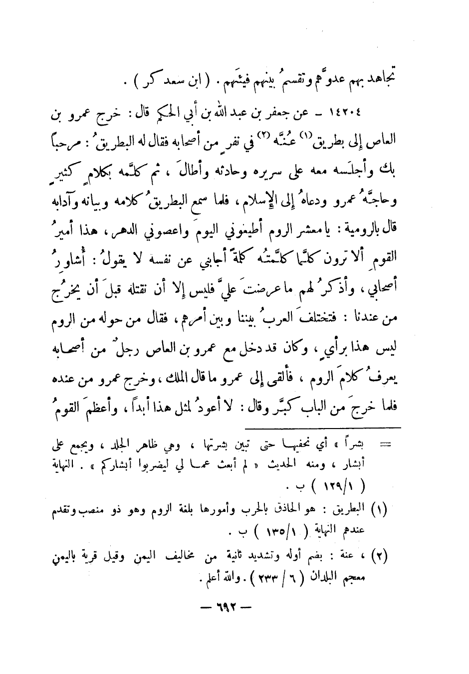 14204- عن جعفر بن عبد الله بن أبي الحكم قال: خرج عمرو بن العاص إلى بطريق1 عنه2 في نفر من أصحابه فقال له البطريق: مرحبا بك وأجلسه معه على سريره وحادثه وأطال، ثم كلمه بكلام كثير وحاجه عمرو ودعاه إلى الإسلام، فلما سمع البطريق كلامه وبيانه وآدابه قال بالرومية: يا معشر الروم أطيعوني اليوم واعصوني الدهر، هذا أمير القوم ألا ترون كلما كلمته كلمة أجابني عن نفسه لا يقول: أشاور أصحابي، وأذكر لهم ما عرضت علي فليس إلا أن نقتله قبل أن يخرج من عندنا: فتختلف العرب بيننا وبين أمرهم، فقال من حوله من الروم ليس هذا برأي، وكان قد دخل مع عمرو بن العاص رجل من أصحابه يعرف كلام الروم، فألقى إلى عمرو ما قال الملك، وخرج عمرو من عنده فلما خرج من الباب كبر وقال: لا أعود لمثل هذا أبدا، وأعظم القوم