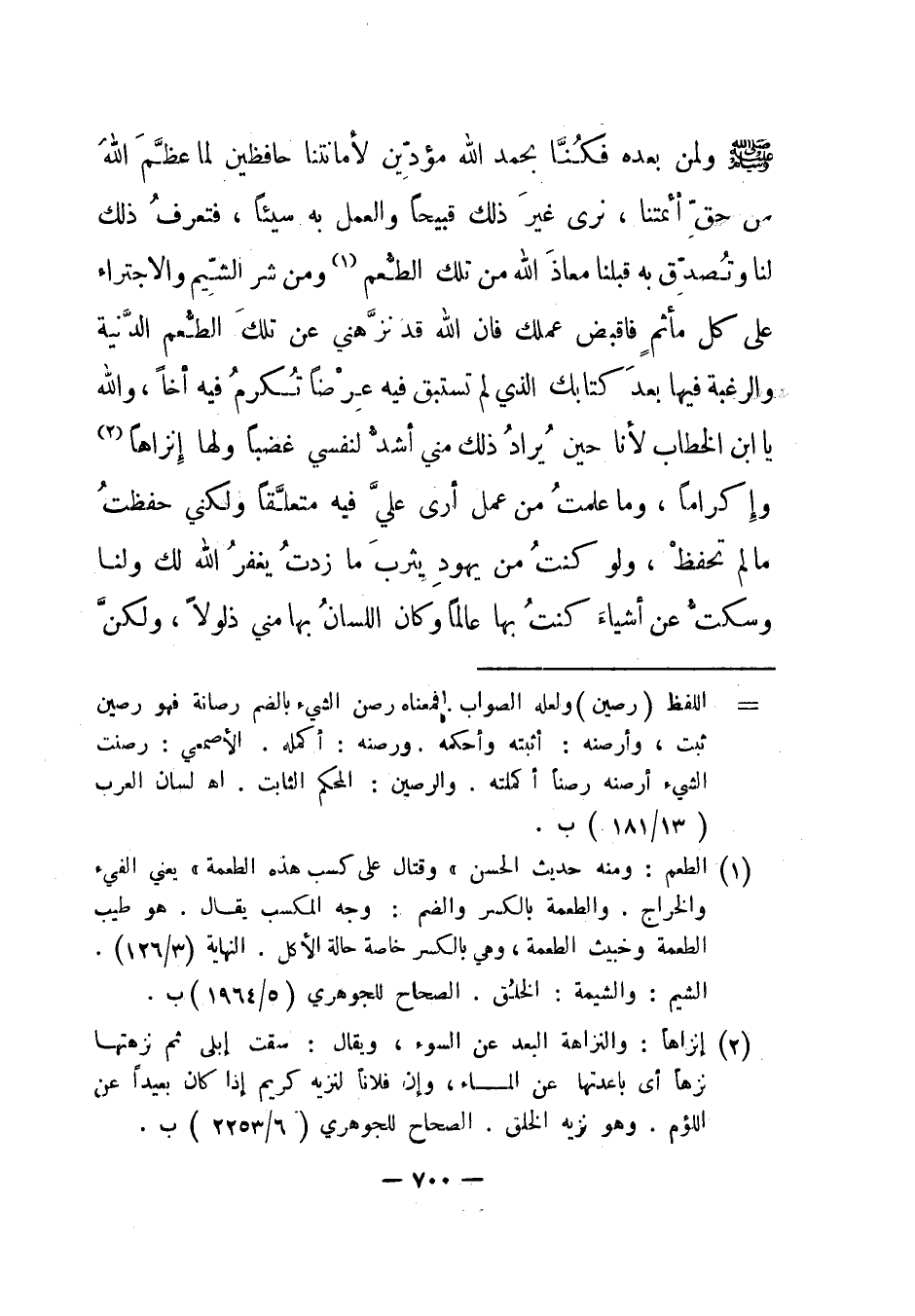 صلى الله عليه وسلم ولمن بعده فكنا بحمد الله مؤدين لأمانتنا حافظين لما عظم الله من حق أئمتنا، نرى غير ذلك قبيحا والعمل به سيئا، فتعرف ذلك لنا وتصدق به قبلنا معاذ الله من تلك الطعم1 ومن شر الشيم والاجتراء على كل مأثم فاقبض عملك فإن الله قد نزهني عن تلك الطعم الدنية والرغبة فيها بعد كتابك الذي لم تستبق فيه عرضا تكرم فيه أخا، والله يا ابن الخطاب لأنا حين يراد ذلك مني أشد لنفسي غضبا ولها إنزاها2 وإكراما، وما علمت من عمل أرى علي فيه متعلقا ولكني حفظت ما لم تحفظ، ولو كنت من يهود يثرب ما زدت يغفر الله لك ولنا وسكت عن أشياء كنت بها عالما وكان اللسان بها مني ذلولا، ولكن
