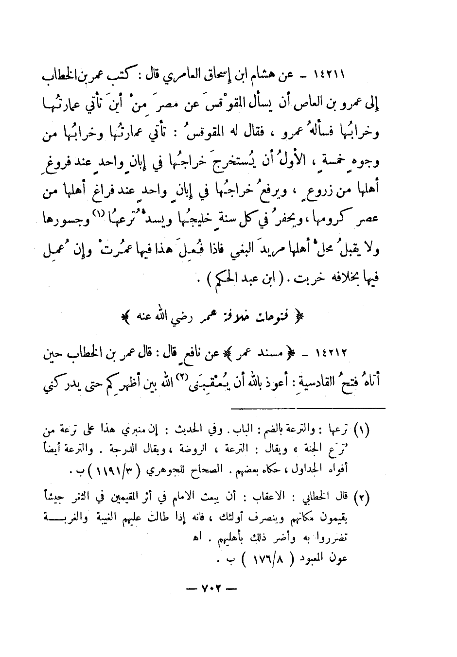 14211-عن هشام بن إسحاق العامري قال: كتب عمر بن الخطاب إلى عمرو بن العاص أن يسأل المقوقس عن مصر من أين تأتي عمارتها وخرابها فسأله عمرو، فقال له المقوقس: تأتي عمارتها وخرابها من وجوه خمسة، الأول أن يستخرج خراجها في إبان واحد عند فروغ أهلها من زروع، ويرفع خراجها في إبان واحد عند فراغ أهلها من عصر كرومها، ويحفر في كل سنة خليجها ويسد ترعها1 وجسورها ولا يقبل محل أهلها مريد البغي فإذا فعل هذا فيها عمرت وإن عمل فيها بخلافه خربت. "ابن عبد الحكم".