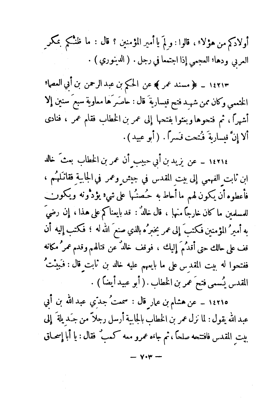 14214- عن يزيد بن أبي حبيب أن عمر بن الخطاب بعث خالد بن ثابت الفهمي إلى بيت المقدس في جيش وعمر في الجابية فقاتلهم، فأعطوه أن يكون لهم ما أحاط به حصنها على شيء يؤدونه ويكون للمسلمين ما كان خارجا منها، قال خالد: قد بايعناكم على هذا، إن رضي به أمير المؤمنين فكتب إلى عمر يخبره بالذي صنع الله له؛ فكتب إليه أن قف على حالك حتى أقدم إليك، فوقف خالد عن قتالهم وقدم عمر مكانه ففتحوا له بيت المقدس على ما بايعهم عليه خالد بن ثابت قال: فبيت المقدس يسمى فتح عمر بن الخطاب. "أبو عبيد أيضا".