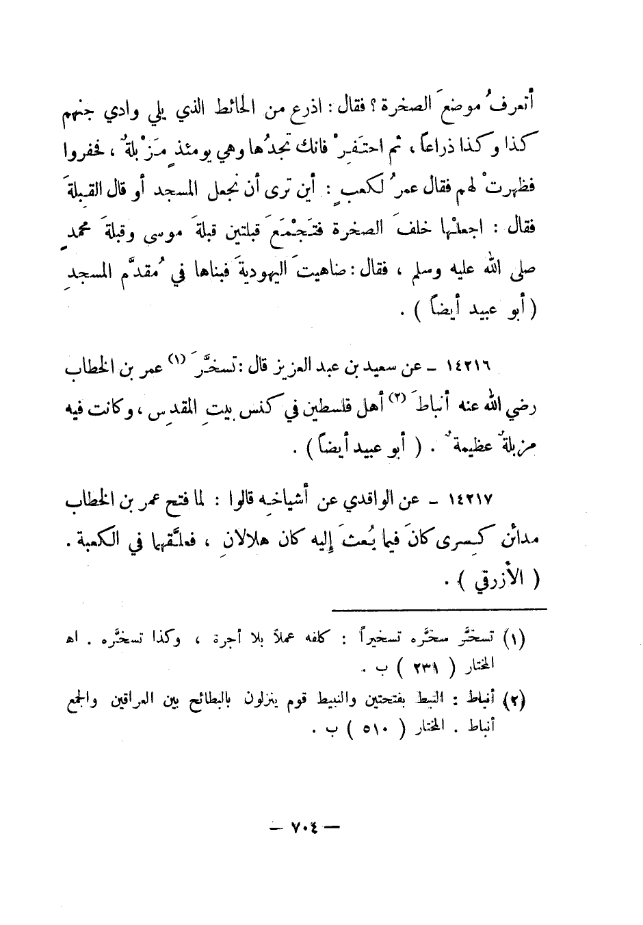 14216- عن سعيد بن عبد العزيز قال: تسخر1 عمر بن الخطاب رضي الله عنه أنباط2 أهل فلسطين في كنس بيت المقدس، وكانت فيه مزبلة عظيمة. "أبو عبيد أيضا".