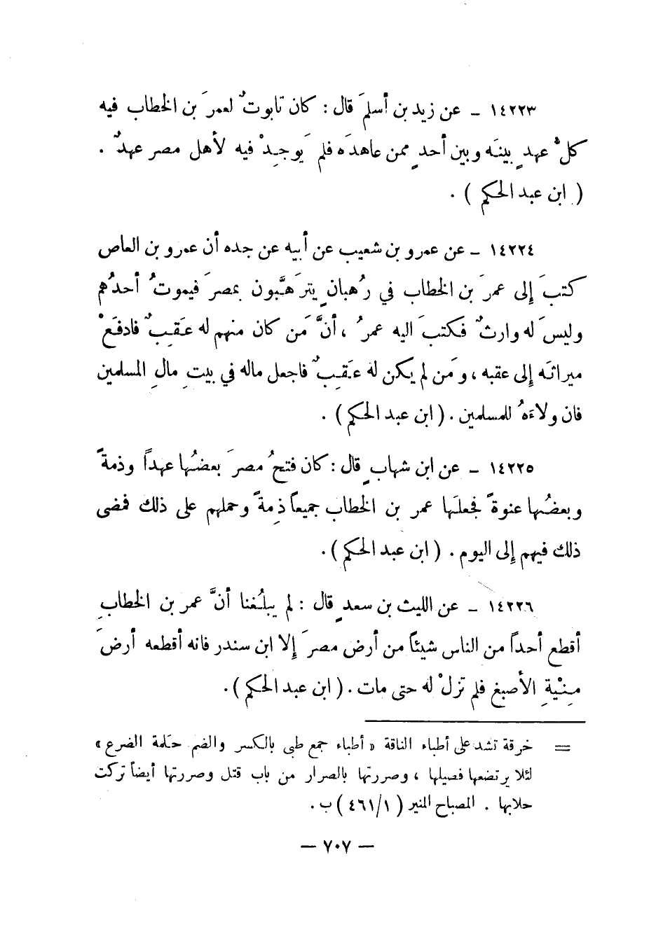 14226- عن الليث بن سعد قال: لم يبلغنا أن عمر بن الخطاب أقطع أحدا من الناس شيئا من أرض مصر إلا ابن سندر فإنه أقطعه أرض منية الأصبغ فلم تزل له حتى مات. "ابن عبد الحكم".