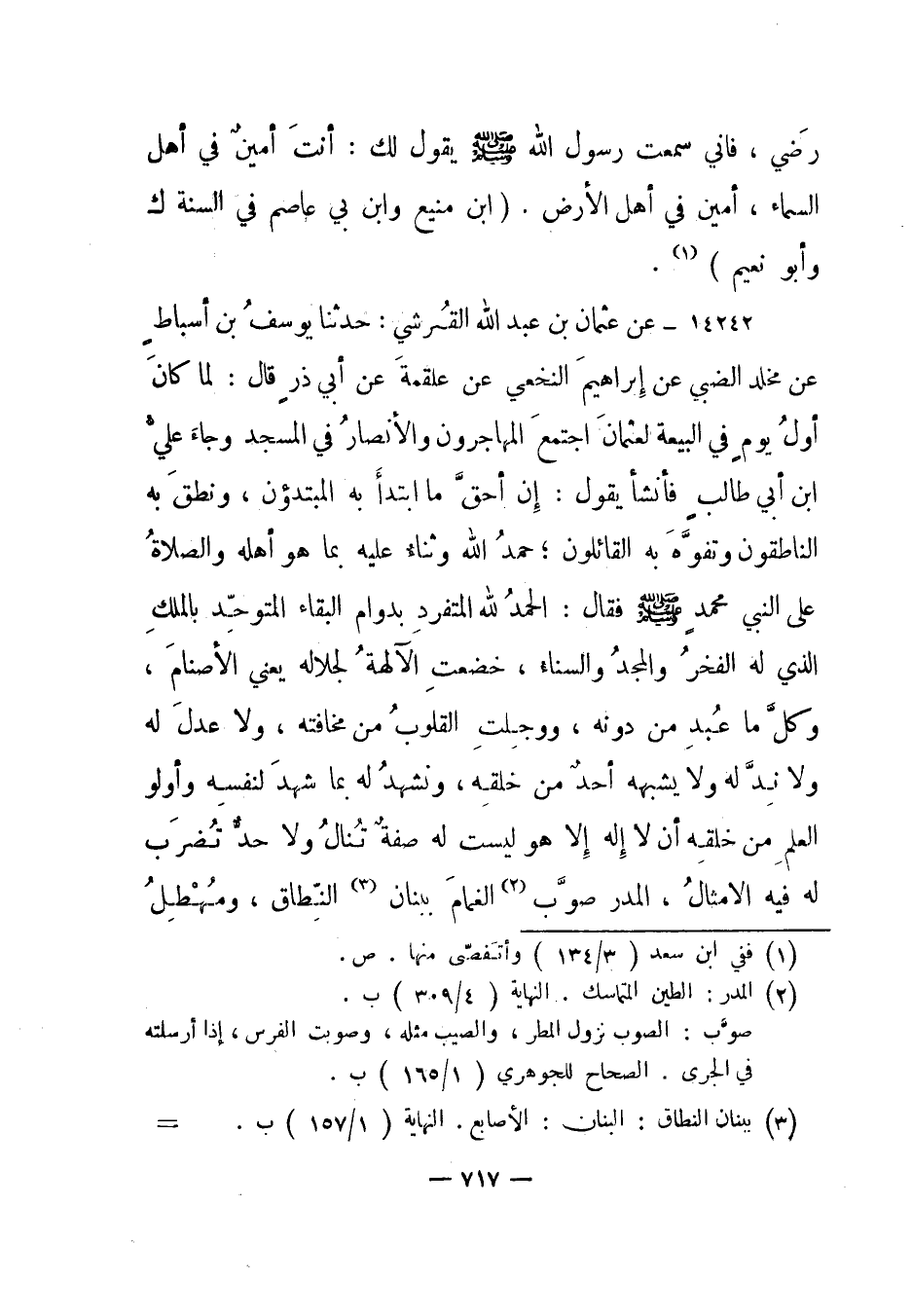 14242- عن عثمان بن عبد الله القرشي: حدثنا يوسف بن أسباط عن مخلد الضبي عن إبراهيم النخعي عن علقمة عن أبي ذر قال: لما كان أول يوم في البيعة لعثمان اجتمع المهاجرون والأنصار في المسجد وجاء علي ابن أبي طالب فأنشأ يقول: إن أحق ما ابتدأ به المبتدؤون، ونطق به الناطقون وتفوه به القائلون؛ حمد الله وثناء عليه بما هو أهله والصلاة على النبي محمد صلى الله عليه وسلم فقال: الحمد لله المتفرد بدوام البقاء المتوحد بالملك الذي له الفخر والمجد والسناء، خضعت الآلهة لجلاله يعني الأصنام، وكل ما عبد من دونه، ووجلت القلوب من مخافته، ولا عدل له ولا ند له ولا يشبهه أحد من خلقه، ونشهد له بما شهد لنفسه وأولو العلم من خلقه أن لا إله إلا هو ليست له صفة تنال ولا حد تضرب له فيه الأمثال، المدر صوب2 الغمام ببنان3 النطاق، ومهطل