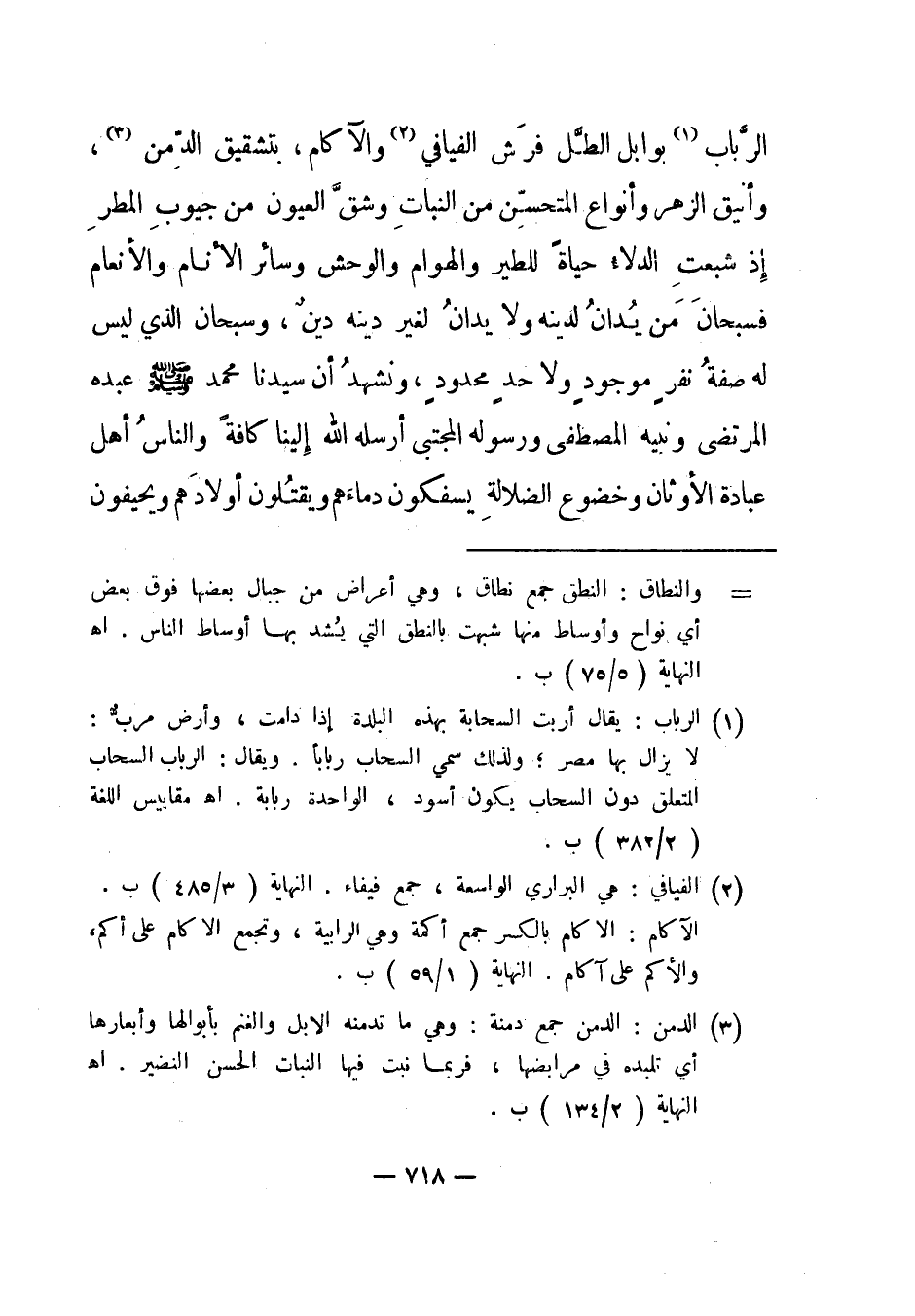 الرباب1 بوابل الطل فرش الفيافي2 والآكام، بتشقيق الدمن3 وأنيق الزهر وأنواع المتحسن من النبات وشق العيون من جيوب المطر إذ شبعت الدلاء حياة للطير والهوام والوحش وسائر الأنام والأنعام فسبحان من يدان لدينه ولا يدان لغير دينه دين، وسبحان الذي ليس له صفة نفر موجود ولا حد محدود، ونشهد أن سيدنا محمد صلى الله عليه وسلم عبده المرتضى ونبيه المصطفى ورسوله المجتبى أرسله الله إلينا كافة والناس أهل عبادة الأوثان وخضوع الضلالة يسفكون دماءهم ويقتلون أولادهم ويحيفون