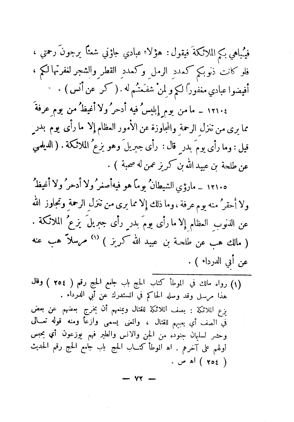 12105- ما رؤي الشيطان يوما هو فيه أصغر ولا أدحر ولا أغيظ ولا أحقر منه يوم عرفة، وما ذلك إلا مما يرى من تنزل الرحمة وتجاوز الله عن الذنوب العظام إلا ما رأى يوم بدر رأى جبريل يزع الملائكة. "مالك هب عن طلحة بن عبيد الله كريز"1 مرسلا "هب عنه عن أبي الدرداء".