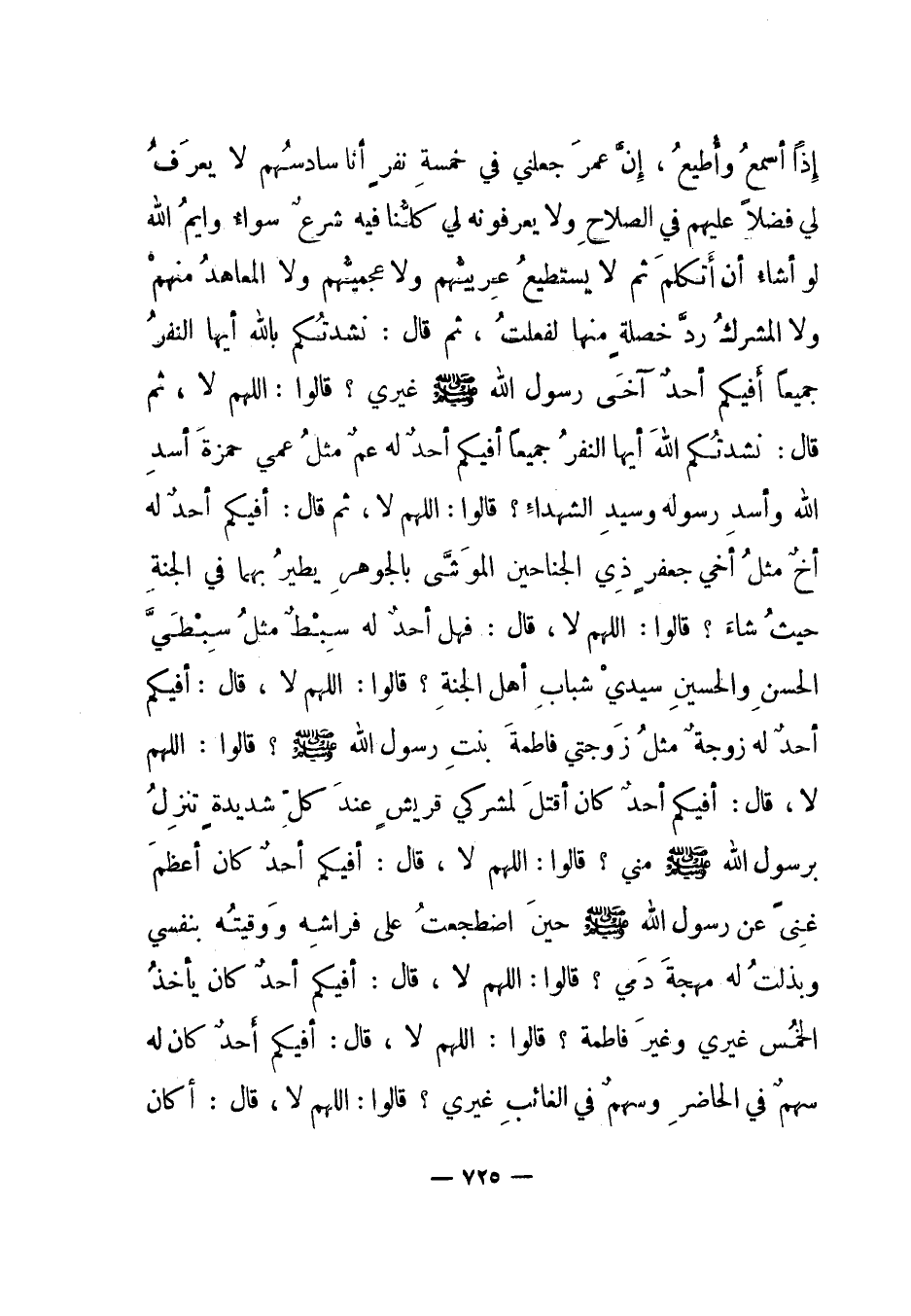 قال: أفيكم أحد كان أقتل لمشركي قريش عند كل شديدة تنزل برسول الله صلى الله عليه وسلم مني؟ قالوا: اللهم لا، قال: أفيكم أحد كان أعظم غنى عن رسول الله صلى الله عليه وسلم حين اضطجعت على فراشه ووقيته بنفسي وبذلت له مهجة دمي؟ قالوا: اللهم لا، قال: أفيكم أحد كان يأخذ الخمس غيري وغير فاطمة؟ قال: اللهم لا، قال: أفيكم أحد كان له سهم في الحاضر وسهم في الغائب غيري؟ قالوا: اللهم لا، قال: أكان