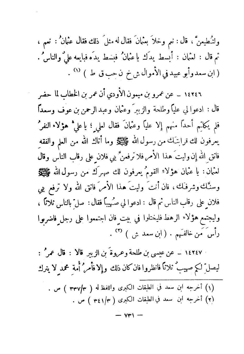 14246- عن عمرو بن ميمون الأودي أن عمر بن الخطاب لما حضر قال: ادعوا لي عليا وطلحة والزبير وعثمان وعبد الرحمن بن عوف وسعدا فلم يكلم أحدا منهم إلا عليا وعثمان فقال لعلي؛ يا علي هؤلاء النفر يعرفون لك قرابتك من رسول الله صلى الله عليه وسلم وما أتاك الله من العلم والفقه فاتق الله إن وليت هذا الأمر فلا ترفعن بني فلان على رقاب الناس وقال لعثمان: يا عثمان هؤلاء القوم يعرفون لك صهرك من رسول الله صلى الله عليه وسلم وسنك وشرفك، فإن أنت وليت هذا الأمر فاتق الله ولا ترفع بني فلان على رقاب الناس ثم قال: ادعوا لي صهيبا فقال: صل بالناس ثلاثا، وليجتمع هؤلاء الرهط فليختلوا في بيت فإن اجتمعوا على رجل فاضربوا رأس من خالفهم. "ابن سعد ش"2